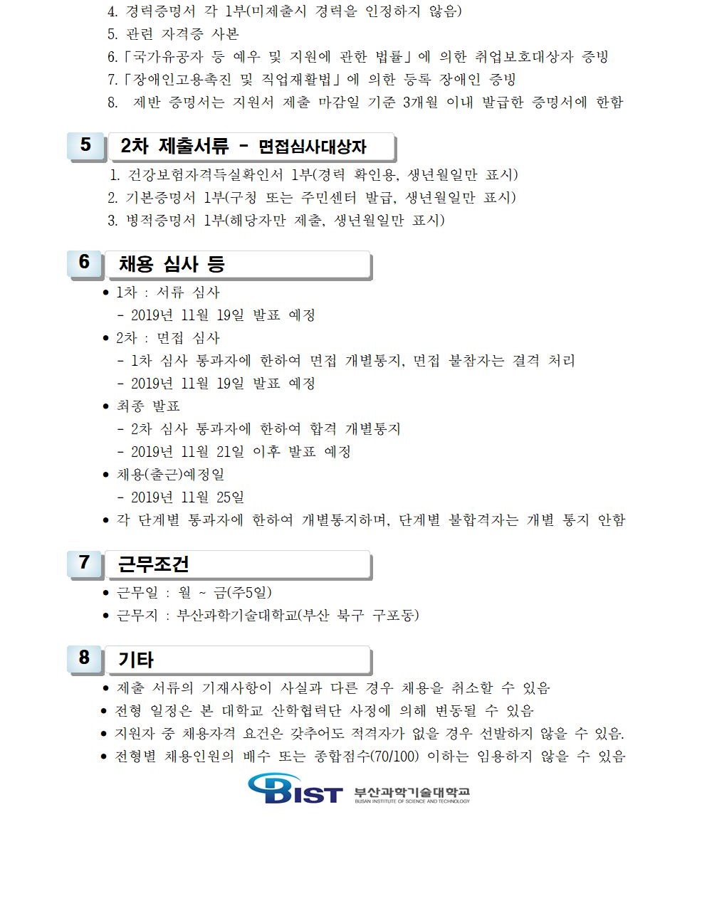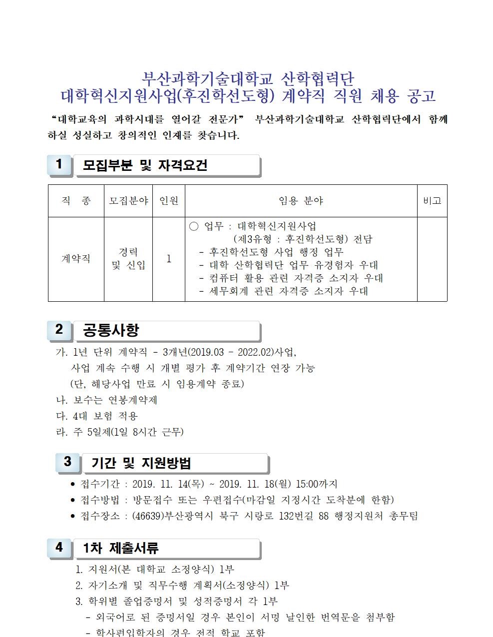 HOME > 기타 > 입찰/채용 입찰/채용 제목 [채용] 부산과학기술대학교 산학협력단(후진학선도형) 계약직 직원 추가 채용 공고 등록일 2019.11.12 07:38:50 작성자 행정지원처 첨부파일 1-2. 공고문(계약직).pdf [176.06 KB]1-3. 지원서 및 자기소개서(계약직).hwp [21.50 KB] 조회 5381 이전글 [채용] 부산과학기술대학교 일반행정(경력직) 계약직 직원 채용 공고 다음글 [입찰]사회맞춤형 기자재 구입(차량주행검사장치) 재공고(긴급) 입찰 목록 비밀글 비밀번호 입력 폼 비밀번호 입력 비밀번호를 입력하여 주세요. 관리자는 확인버튼만 누르시면 됩니다. 비밀번호 잘못된 비밀번호입니다. 비밀번호를 다시 입력해주세요. 확인