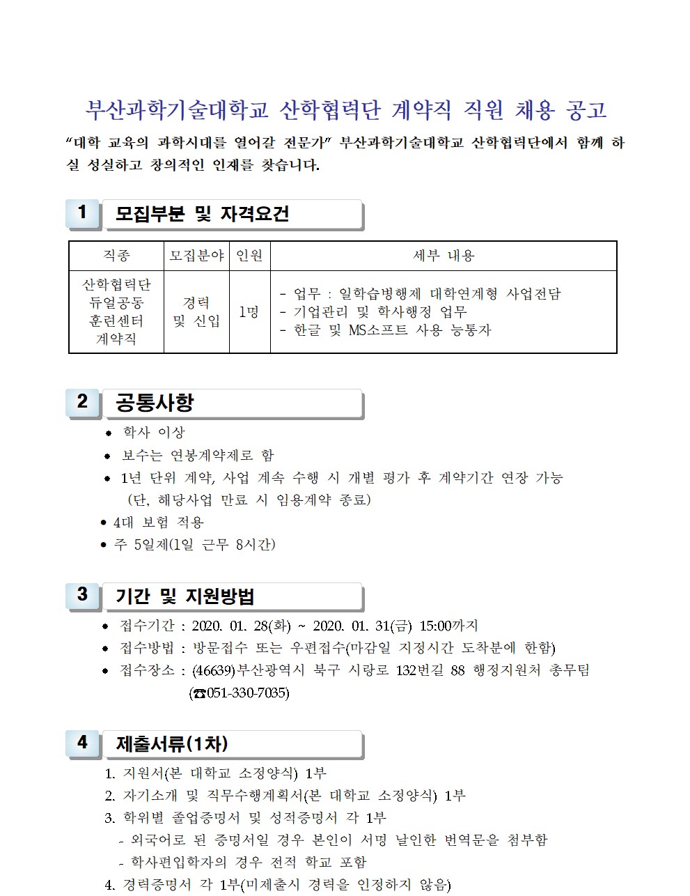 HOME > 기타 > 입찰/채용 입찰/채용 제목 [채용] 부산과학기술대학교 산학협력단 듀얼공동훈련센터 전담 계약직 직원 채용 등록일 2020.01.17 11:43:46 작성자 행정지원처 첨부파일 1-3. 지원서 및 자기소개서(산단-듀얼공동훈련센터-일학습).hwp [21.50 KB]1-2. 공고문(산단-듀얼공동훈련센터-일학습).pdf [181.17 KB] 조회 4443 이전글 [입찰]사회맞춤형 실습실 환경개선 공사 입찰 다음글 [채용] 부산과학기술대학교 일반행정 계약직 직원 채용 공고 목록 비밀글 비밀번호 입력 폼 비밀번호 입력 비밀번호를 입력하여 주세요. 관리자는 확인버튼만 누르시면 됩니다. 비밀번호 잘못된 비밀번호입니다. 비밀번호를 다시 입력해주세요. 확인