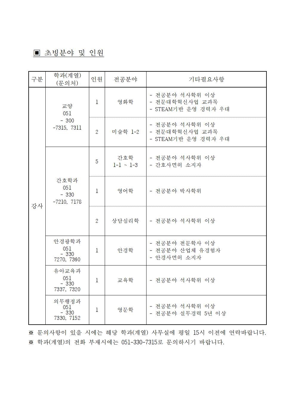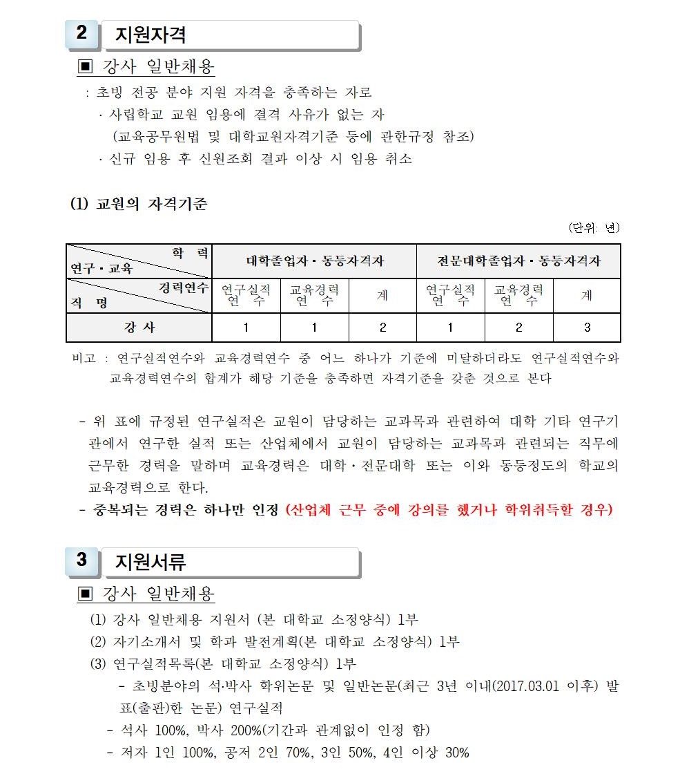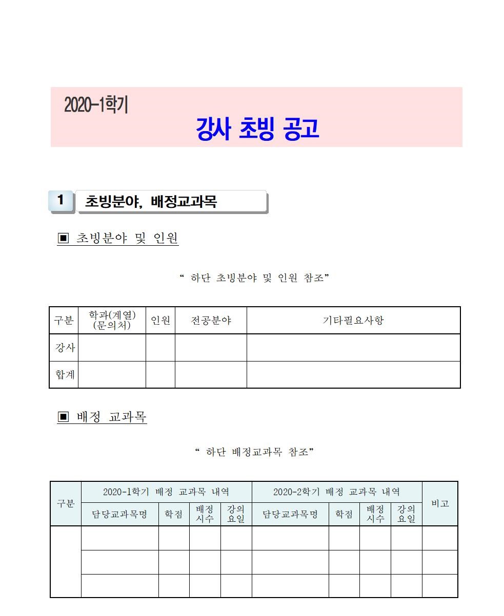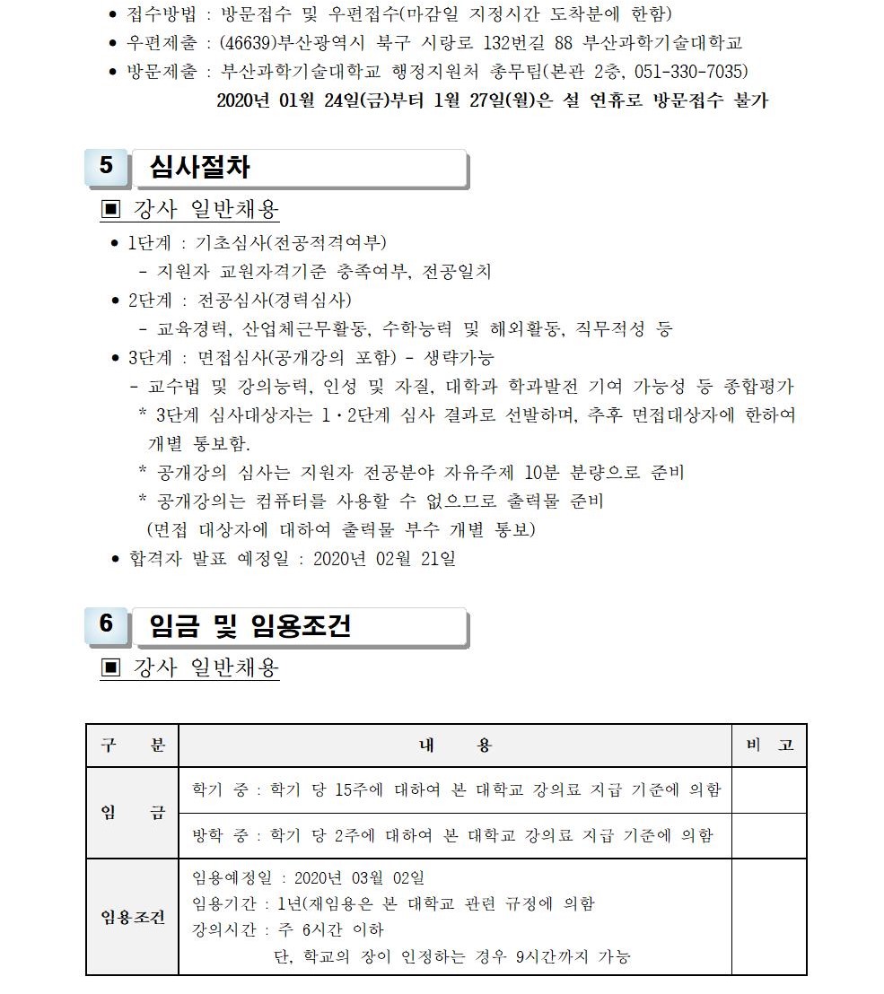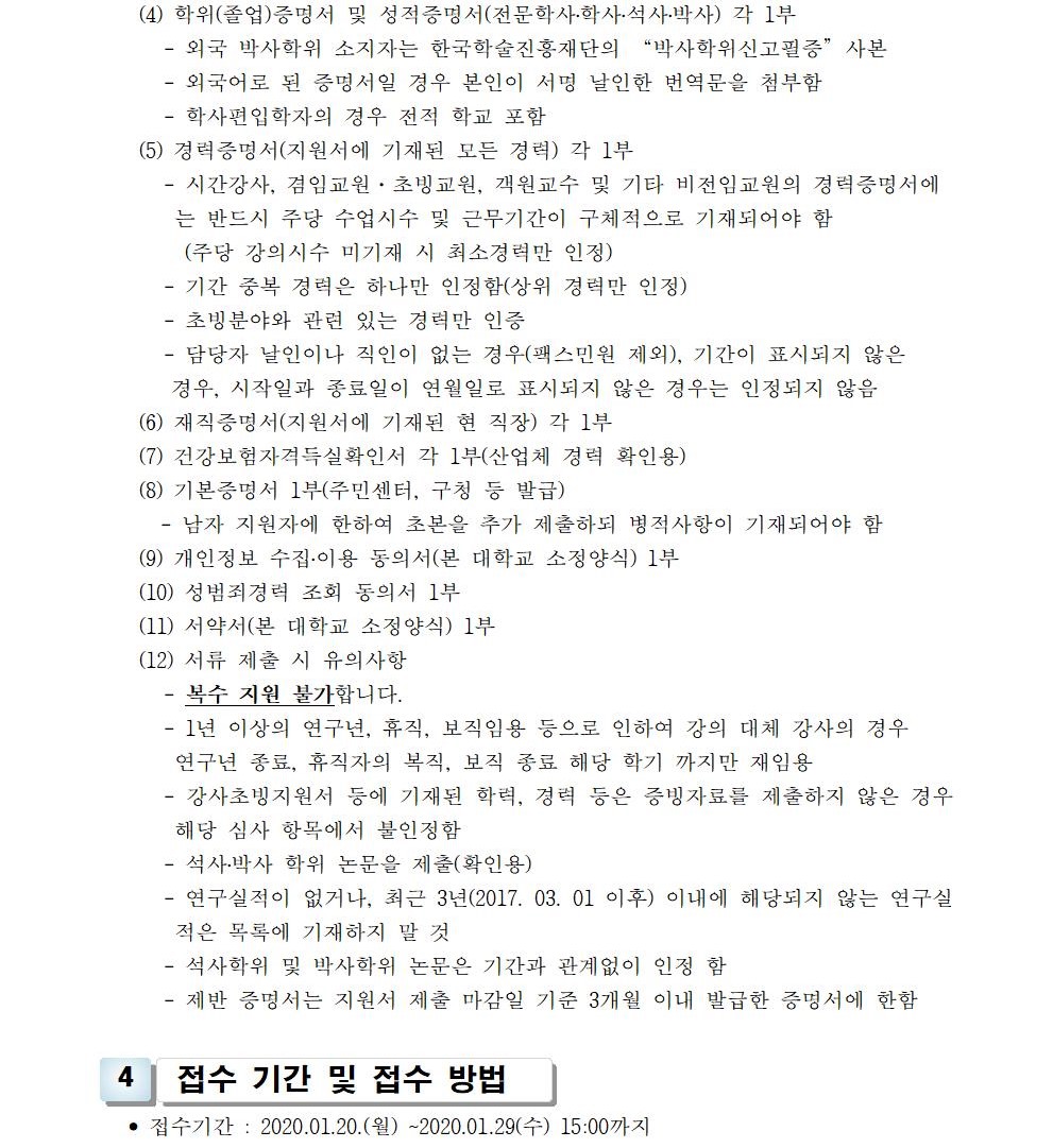 HOME > 기타 > 입찰/채용 입찰/채용 제목 [채용] 2020학년도 1학기 교원(강사) 초빙 공고 등록일 2020.01.20 11:01:16 작성자 행정지원처 첨부파일 1-1-3-가-1. 강사신규임용계획(공고문).pdf [212.13 KB]1-1-5-가. 강사 일반채용 구비서류.zip [54.78 KB] 조회 6173 이전글 [채용] 2020학년도 1학기 비전임교원(겸임교원) 초빙 공고 다음글 [입찰]대학혁신 진리관 PBL실습실 환경개선공사 입찰(긴급) 목록 비밀글 비밀번호 입력 폼 비밀번호 입력 비밀번호를 입력하여 주세요. 관리자는 확인버튼만 누르시면 됩니다. 비밀번호 잘못된 비밀번호입니다. 비밀번호를 다시 입력해주세요. 확인