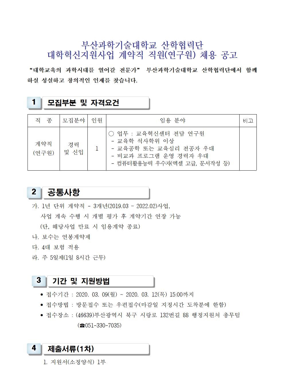 HOME > 기타 > 입찰/채용 입찰/채용 제목 [채용] 산학협력단 대학혁신지원사업 교육혁신센터 전담 계약직 직원(연구원) 채용 등록일 2020.02.28 08:07:25 작성자 행정지원처 첨부파일 1-2. 공고문(계약직).pdf [176.34 KB]1-3. 지원서 및 자기소개서(계약직).hwp [24.00 KB] 조회 5201 이전글 [입찰]정보시스템 통합 유지보수 (재공고)(긴급) 다음글 [채용] 산학협력단 대학혁신지원사업 학생진로심리상담센터 전담 계약직 직원 채용 목록 비밀글 비밀번호 입력 폼 비밀번호 입력 비밀번호를 입력하여 주세요. 관리자는 확인버튼만 누르시면 됩니다. 비밀번호 잘못된 비밀번호입니다. 비밀번호를 다시 입력해주세요. 확인