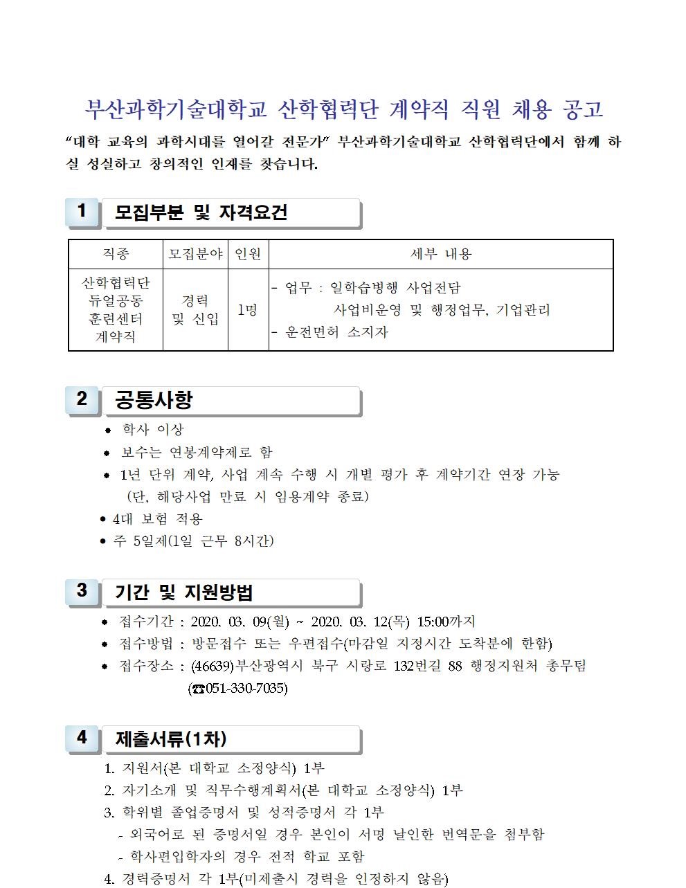 HOME > 기타 > 입찰/채용 입찰/채용 제목 [채용] 산학협력단 듀얼공동훈련센터(일학습병행제사업) 전담 계약직 직원 채용 등록일 2020.02.28 08:15:24 작성자 행정지원처 첨부파일 1-2. 공고문(산단-듀얼공동훈련센터-일학습).pdf [180.99 KB]1-3. 지원서 및 자기소개서(산단-듀얼공동훈련센터-일학습).hwp [21.50 KB] 조회 4939 이전글 [채용] 산학협력단 대학혁신지원사업 학생진로심리상담센터 전담 계약직 직원 채용 다음글 [입찰] 학교법인 중앙학원 소유 토지 매각 입찰 재공고 목록 비밀글 비밀번호 입력 폼 비밀번호 입력 비밀번호를 입력하여 주세요. 관리자는 확인버튼만 누르시면 됩니다. 비밀번호 잘못된 비밀번호입니다. 비밀번호를 다시 입력해주세요. 확인