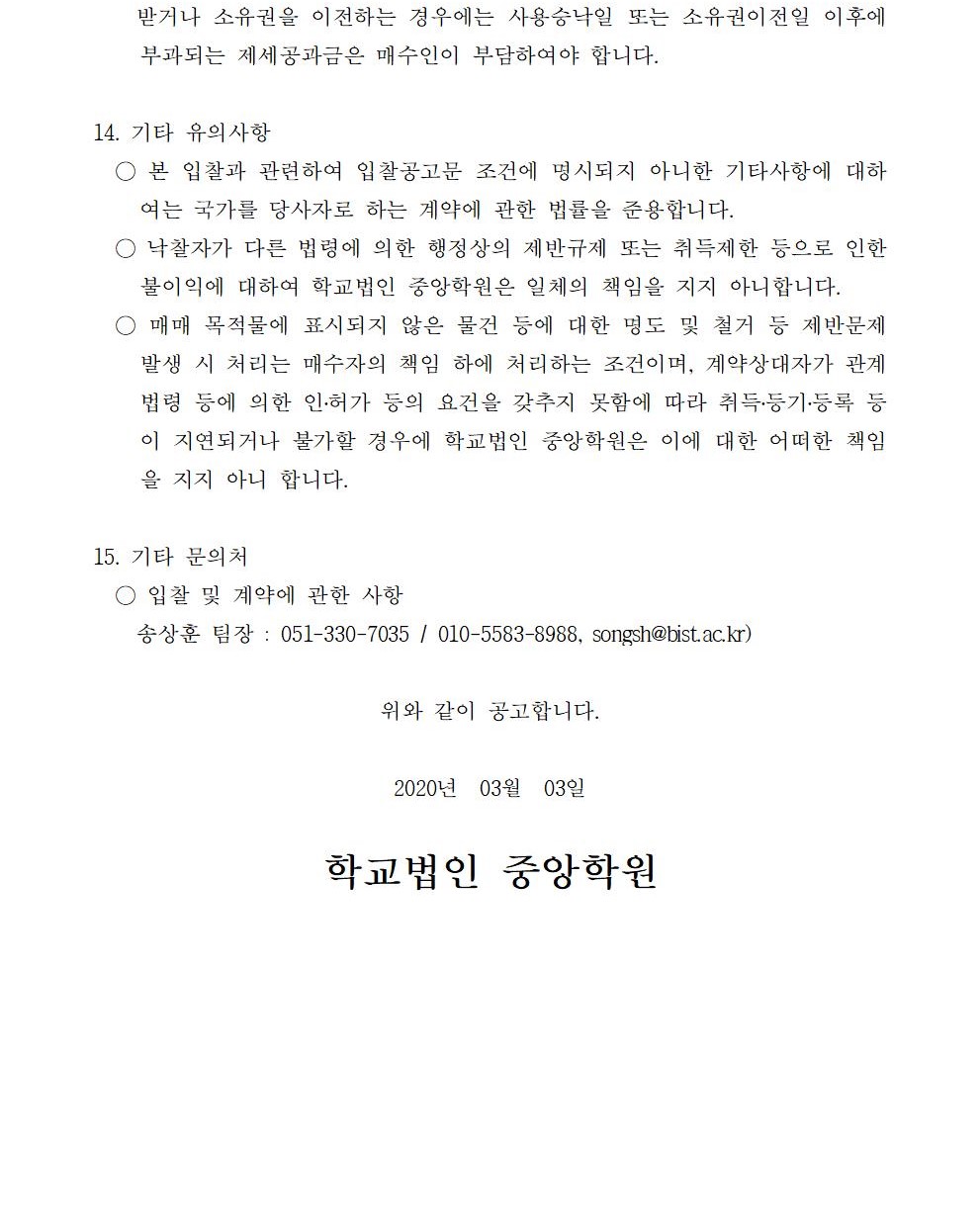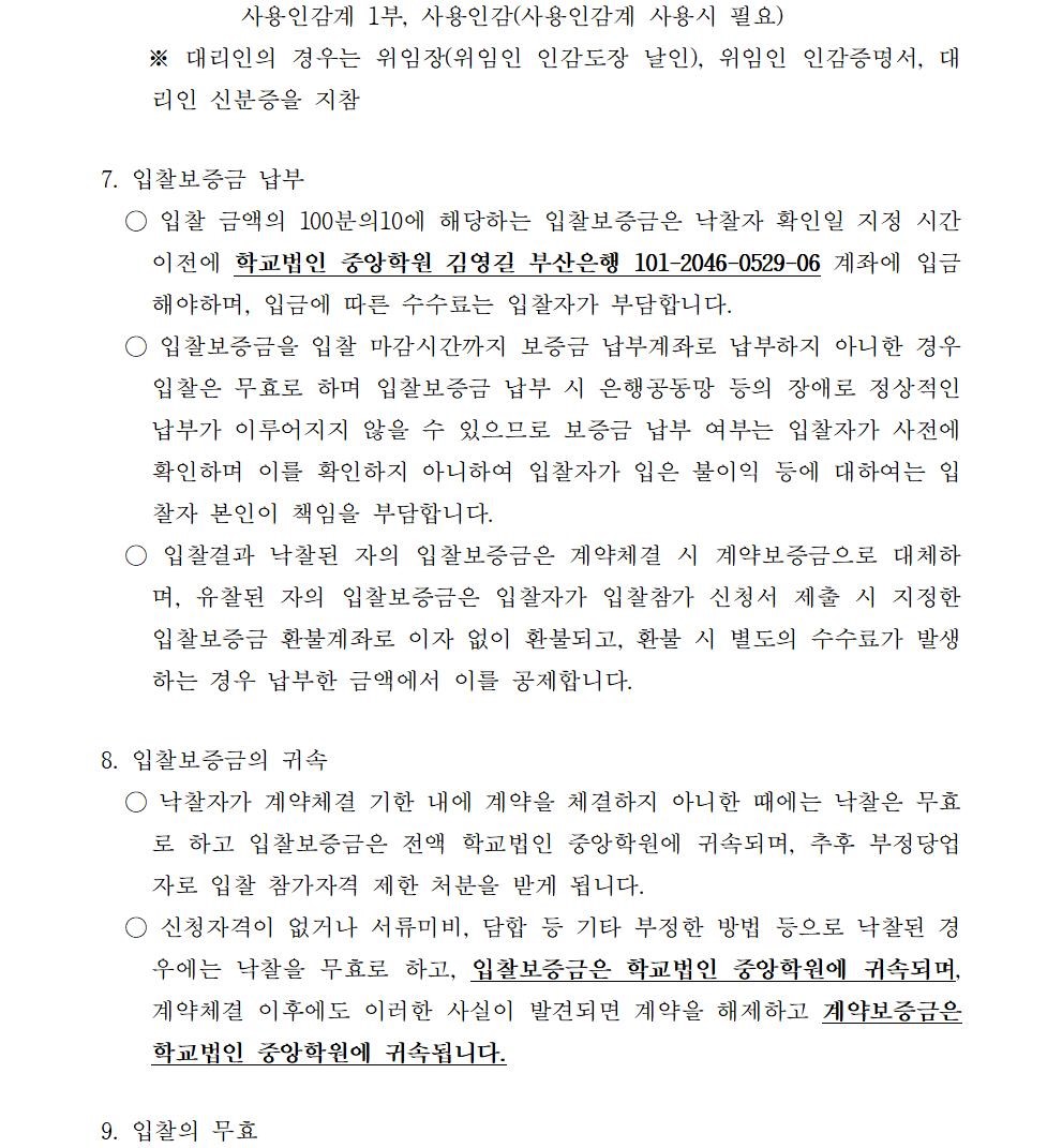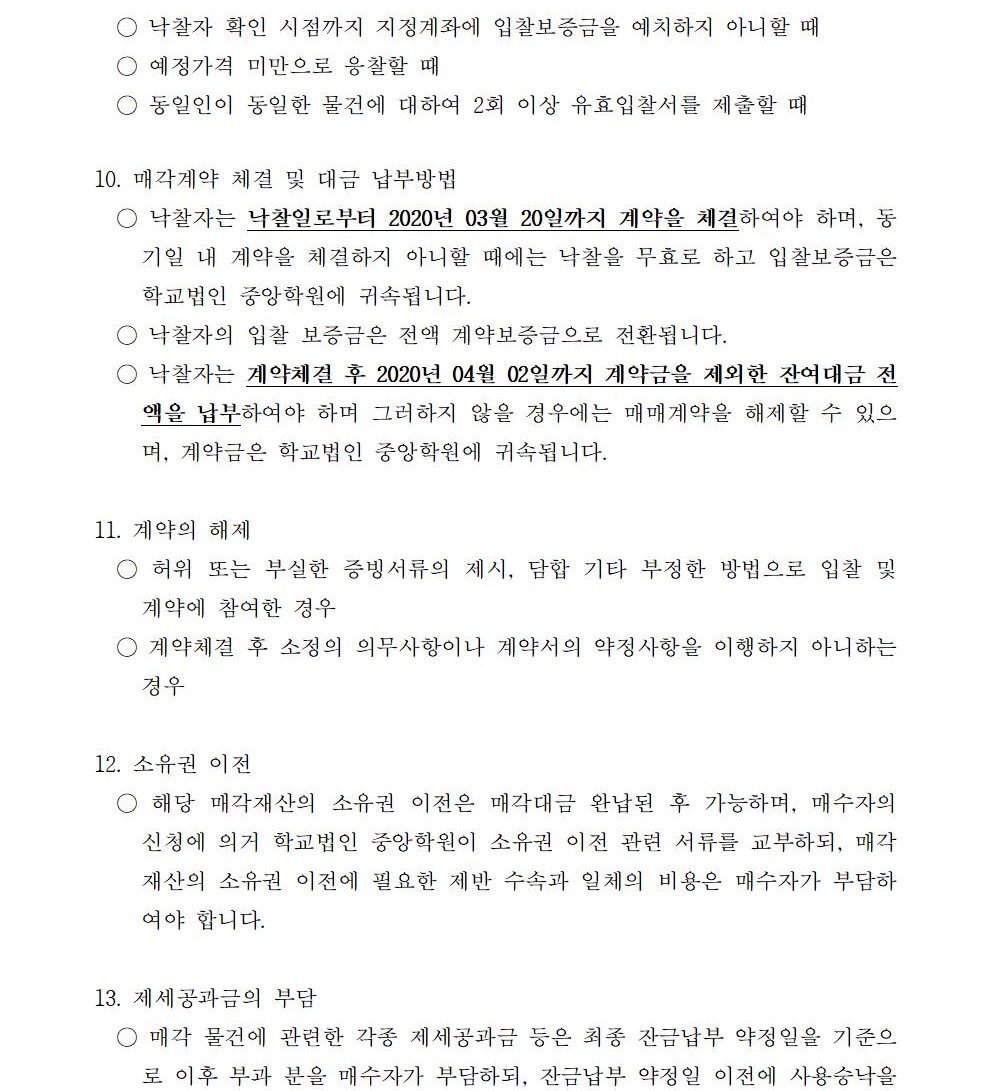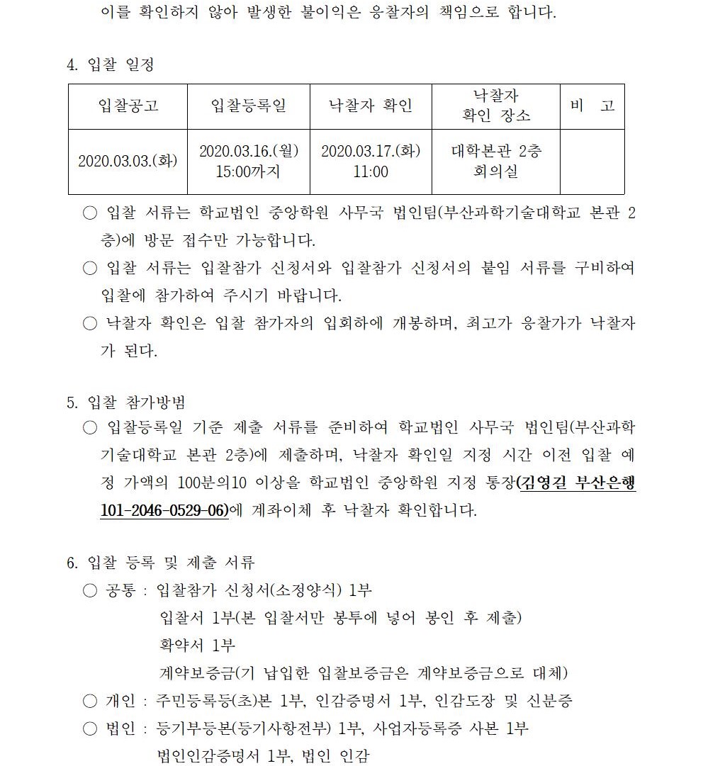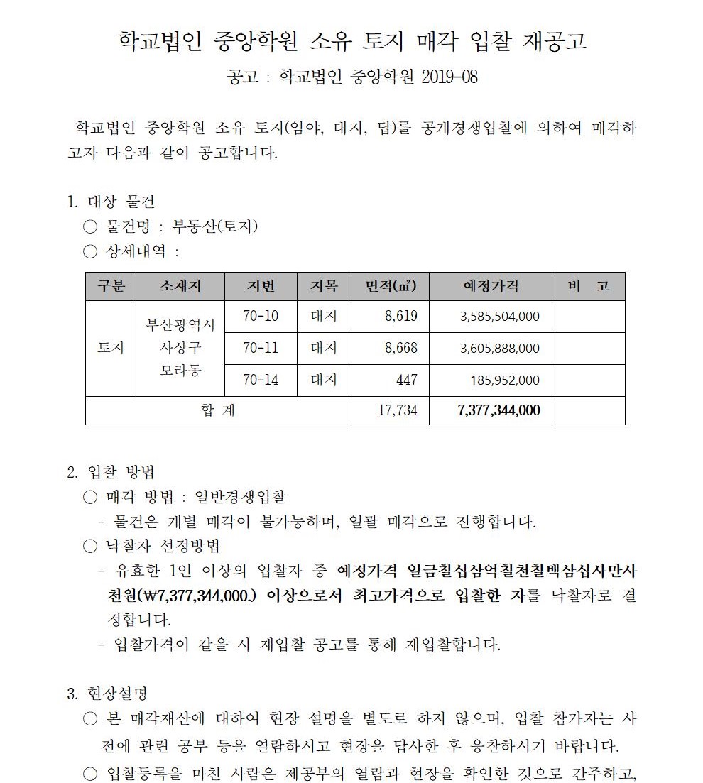 HOME > 기타 > 입찰/채용 입찰/채용 제목 [입찰] 학교법인 중앙학원 소유 토지 매각 입찰 재공고 등록일 2020.03.03 08:03:07 작성자 행정지원처 첨부파일 붙임4 입찰서, 유의사항.pdf [39.56 KB]붙임3 입찰참가 신청서.pdf [43.15 KB]붙임2 안내문.pdf [503.36 KB]붙임1 매각공고문.pdf [78.68 KB]붙임5. 확약서.pdf [29.99 KB] 조회 5335 이전글 [채용] 산학협력단 듀얼공동훈련센터(일학습병행제사업) 전담 계약직 직원 채용 다음글 [채용] 2020학년도 1학기 교원(강사) 초빙 추가 공고(3차) 목록 비밀글 비밀번호 입력 폼 비밀번호 입력 비밀번호를 입력하여 주세요. 관리자는 확인버튼만 누르시면 됩니다. 비밀번호 잘못된 비밀번호입니다. 비밀번호를 다시 입력해주세요. 확인