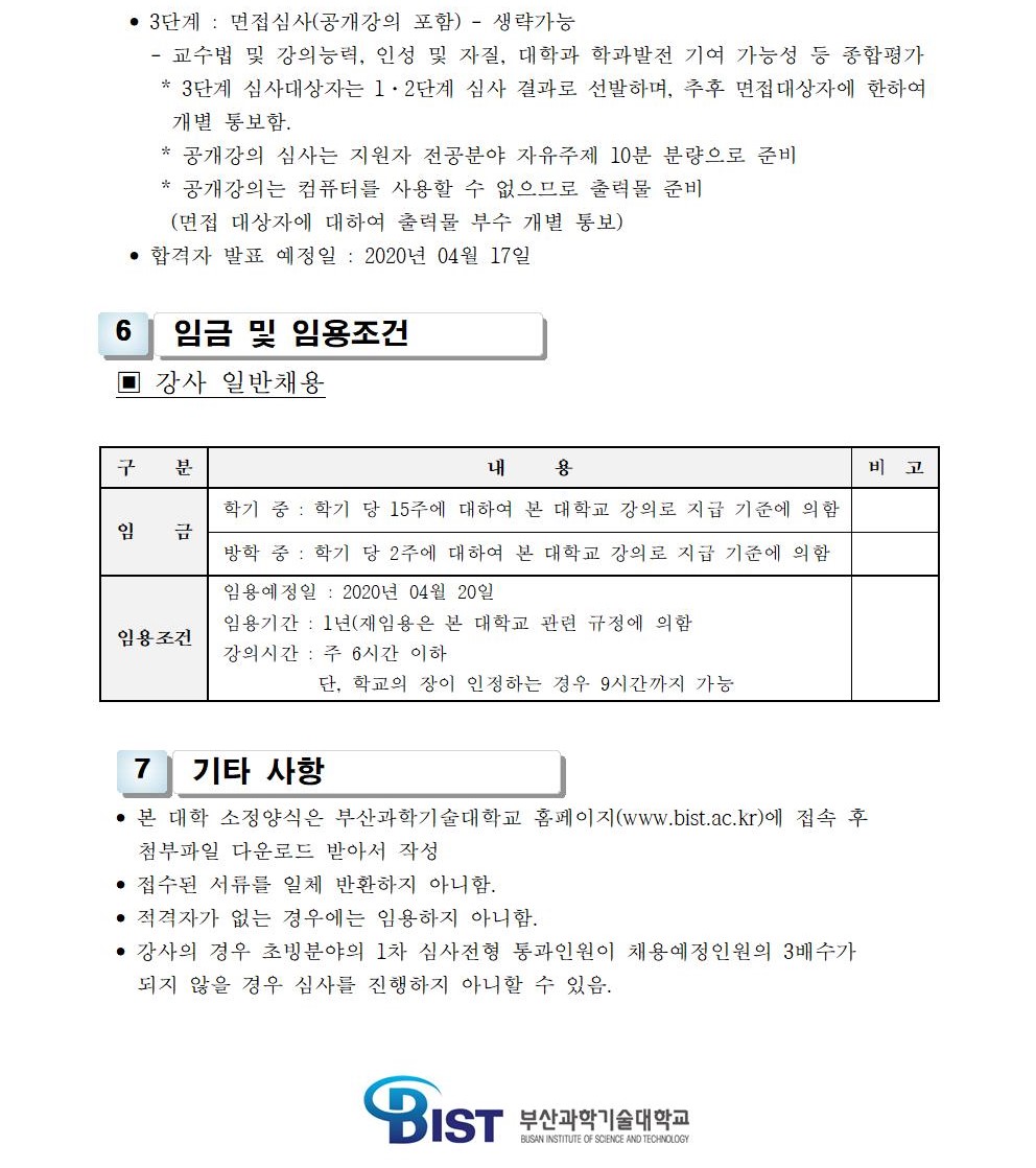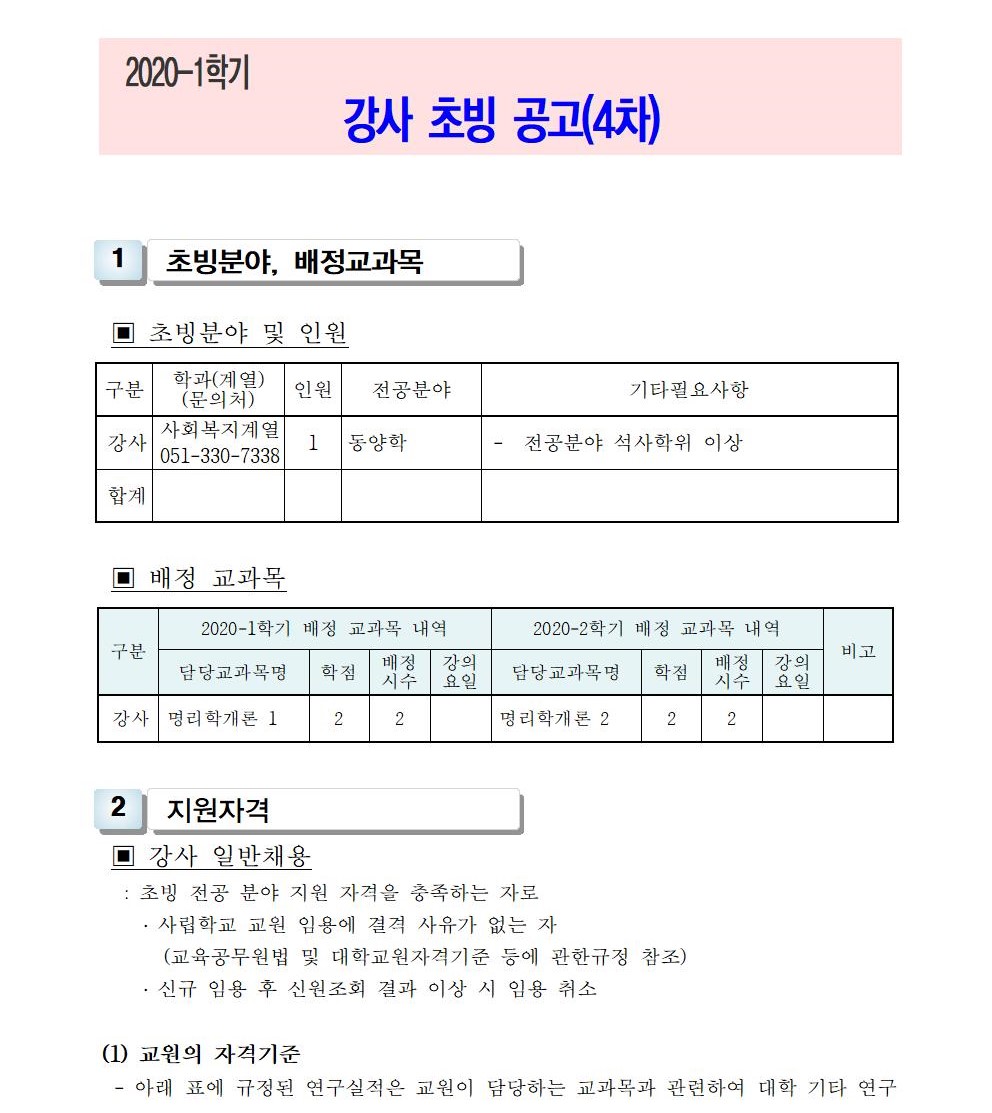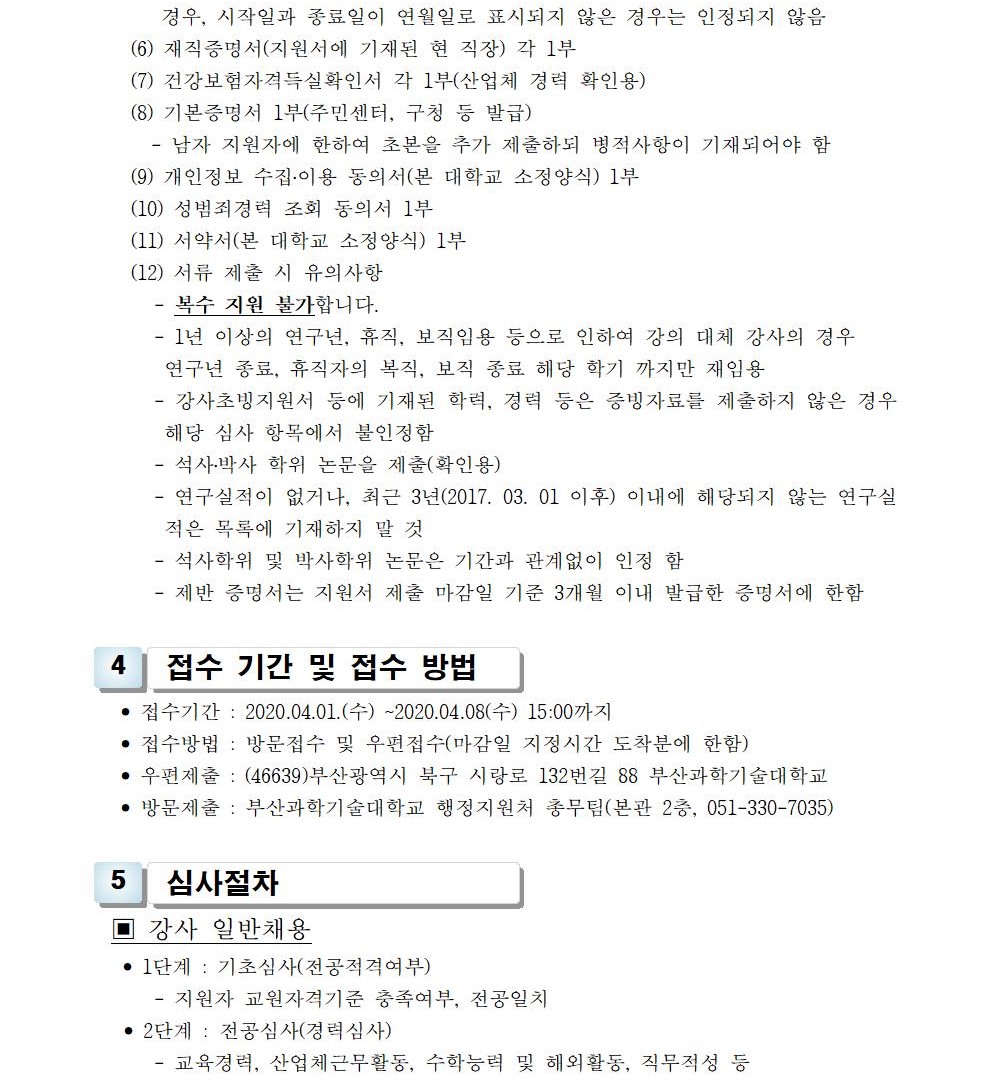 HOME > 기타 > 입찰/채용 입찰/채용 제목 [채용] 2020학년도 1학기 교원(강사) 초빙 추가 공고(4차) 등록일 2020.04.01 09:32:22 작성자 행정지원처 첨부파일 1-1-5-가. 강사 일반채용 구비서류.zip [54.45 KB]1-1-3-가-1-1. 강사신규임용계획(공고문).pdf [186.83 KB] 조회 5565 이전글 [입찰]부산과학기술대학교 입시홍보물 제작 용역(협상에 의한 계약) 입찰 공고(긴급) 다음글 [채용] 산학협력단관 부산소방재난본부 용역사업(소방공무원 상담) 전담 계약직 직원 채용 목록 비밀글 비밀번호 입력 폼 비밀번호 입력 비밀번호를 입력하여 주세요. 관리자는 확인버튼만 누르시면 됩니다. 비밀번호 잘못된 비밀번호입니다. 비밀번호를 다시 입력해주세요. 확인