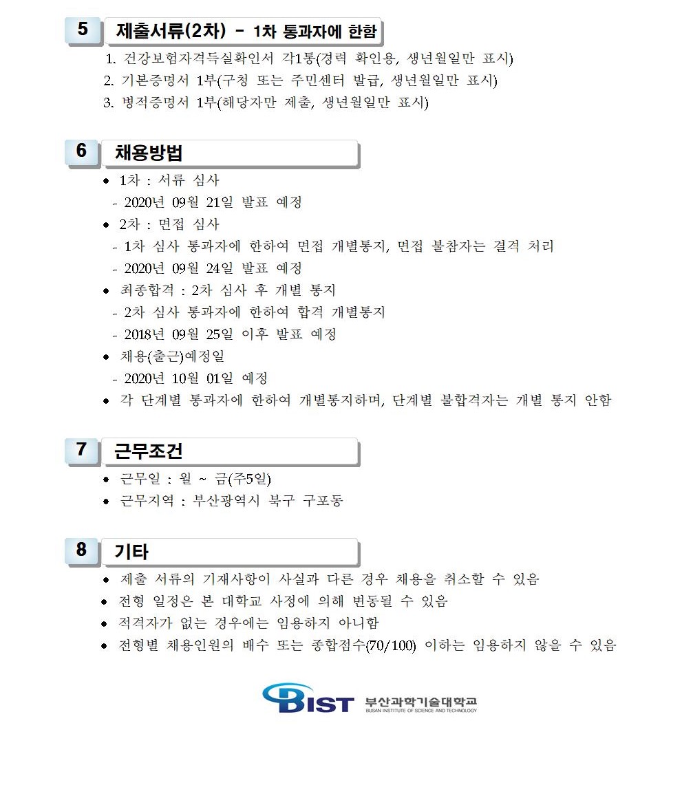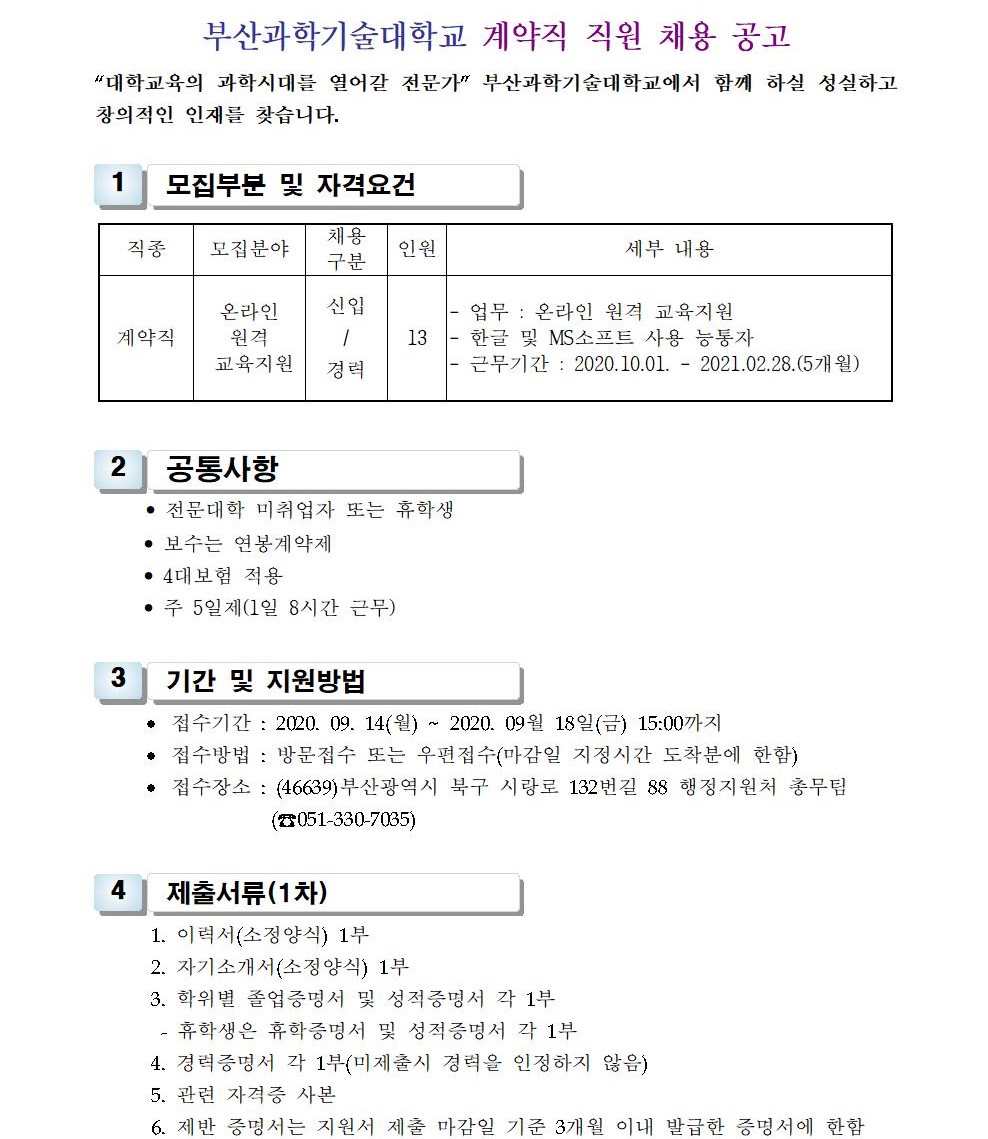 HOME > 기타 > 입찰/채용 입찰/채용 제목 [채용] 대학 온라인 원격 교육지원 계약직 직원 채용 공고 등록일 2020.09.09 15:10:34 작성자 행정지원처 첨부파일 1-2. 공고문(온라인도우미).pdf [178.63 KB]1-3. 지원서 및 자기소개서(계약직).hwp [23.50 KB] 조회 3660 이전글 [채용] 2020학년도 2학기 비정년 전임교원 초빙 추가(4차) 공고 다음글 [채용] 산학협력단 대학혁신지원사업 전담 계약직 직원 채용 재공고 목록 비밀글 비밀번호 입력 폼 비밀번호 입력 비밀번호를 입력하여 주세요. 관리자는 확인버튼만 누르시면 됩니다. 비밀번호 잘못된 비밀번호입니다. 비밀번호를 다시 입력해주세요. 확인