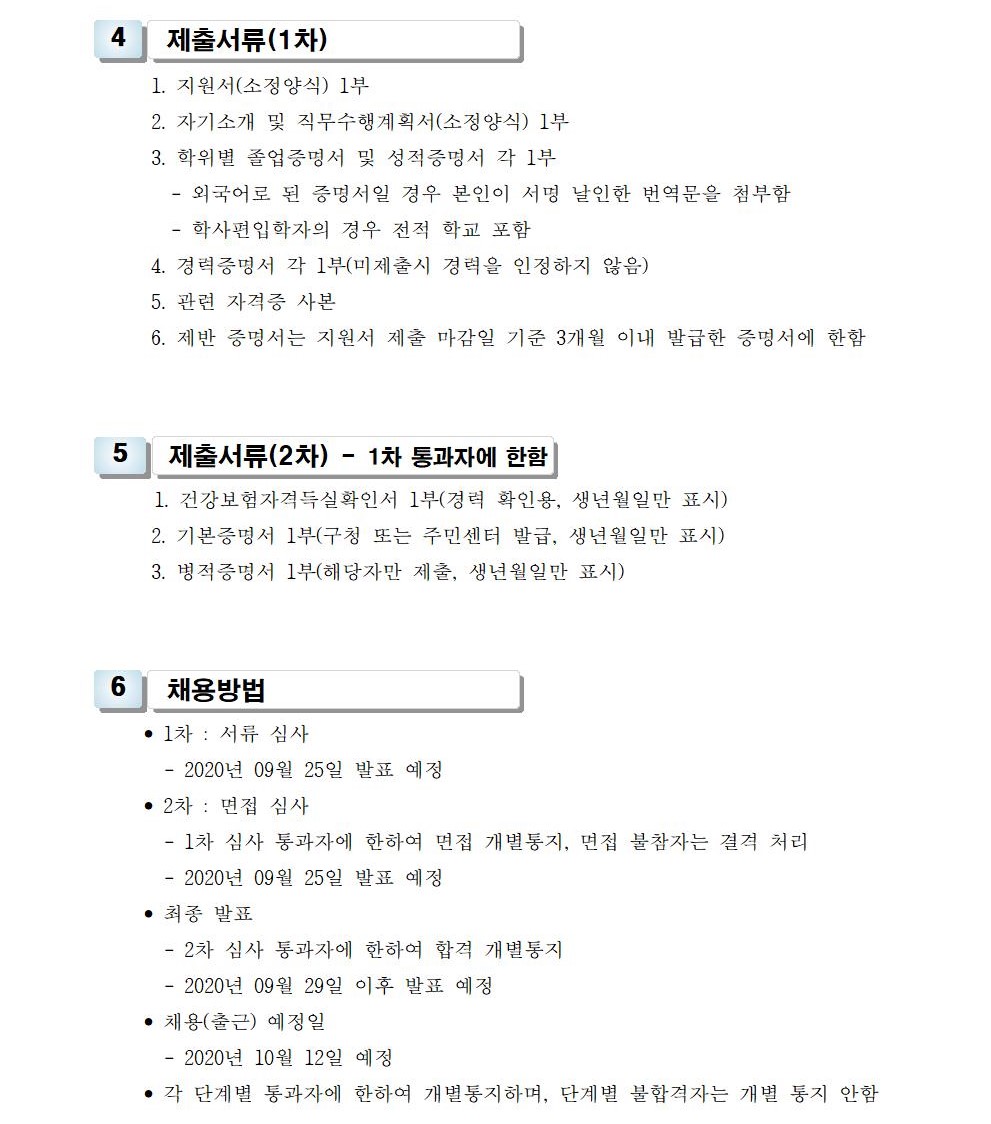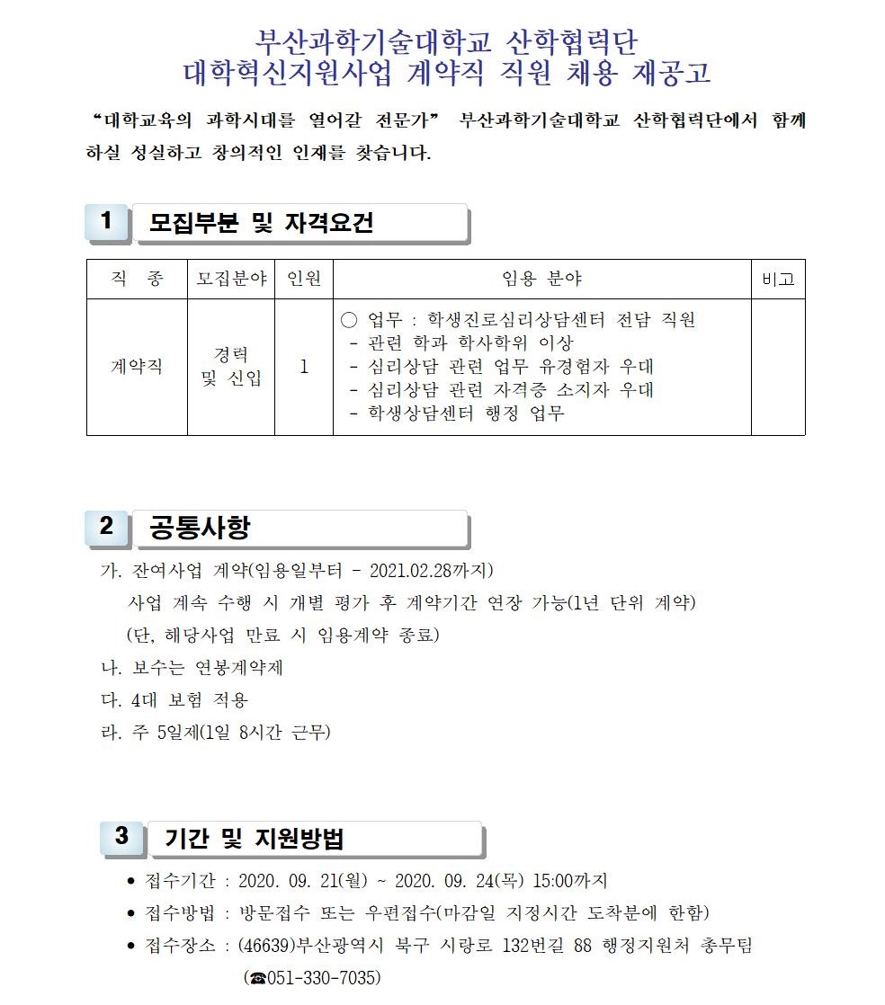 HOME > 기타 > 입찰/채용 입찰/채용 제목 [채용] 산학협력단 대학혁신지원사업 전담 계약직 직원 채용 재공고 등록일 2020.09.10 08:33:25 작성자 행정지원처 첨부파일 1-2. 공고문(계약직).pdf [174.06 KB]1-3. 지원서 및 자기소개서(계약직).hwp [24.00 KB] 조회 3642 이전글 [채용] 대학 온라인 원격 교육지원 계약직 직원 채용 공고 다음글 [입찰] 사회맞춤형 기자재 (커피 로스터머신 등) 구입 입찰 목록 비밀글 비밀번호 입력 폼 비밀번호 입력 비밀번호를 입력하여 주세요. 관리자는 확인버튼만 누르시면 됩니다. 비밀번호 잘못된 비밀번호입니다. 비밀번호를 다시 입력해주세요. 확인
