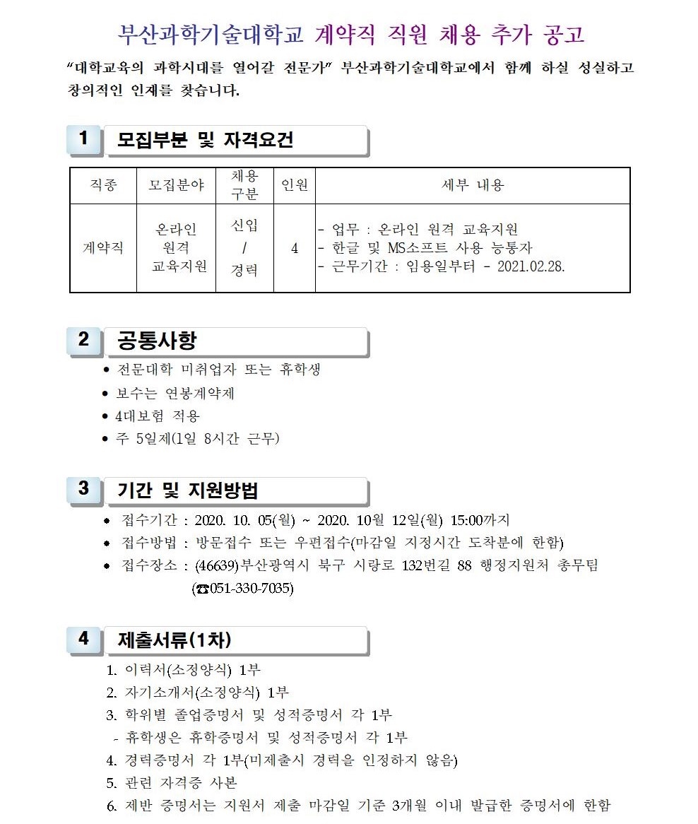 HOME > 기타 > 입찰/채용 입찰/채용 제목 [채용] 대학 온라인 원격 교육지원 계약직 직원 추가 공고 등록일 2020.09.29 12:39:41 작성자 행정지원처 첨부파일 1-3. 지원서 및 자기소개서(계약직).hwp [23.50 KB]1-2. 공고문(온라인도우미).pdf [178.69 KB] 조회 3497 이전글 [입찰] 사회맞춤형 기자재(무패턴옥습기 등) 구입 입찰 다음글 [채용] 산학협력단 정부재정지원사업 사업전담 연구교수 채용 공고 목록 비밀글 비밀번호 입력 폼 비밀번호 입력 비밀번호를 입력하여 주세요. 관리자는 확인버튼만 누르시면 됩니다. 비밀번호 잘못된 비밀번호입니다. 비밀번호를 다시 입력해주세요. 확인