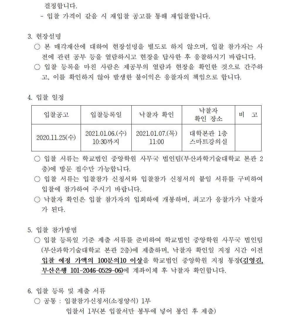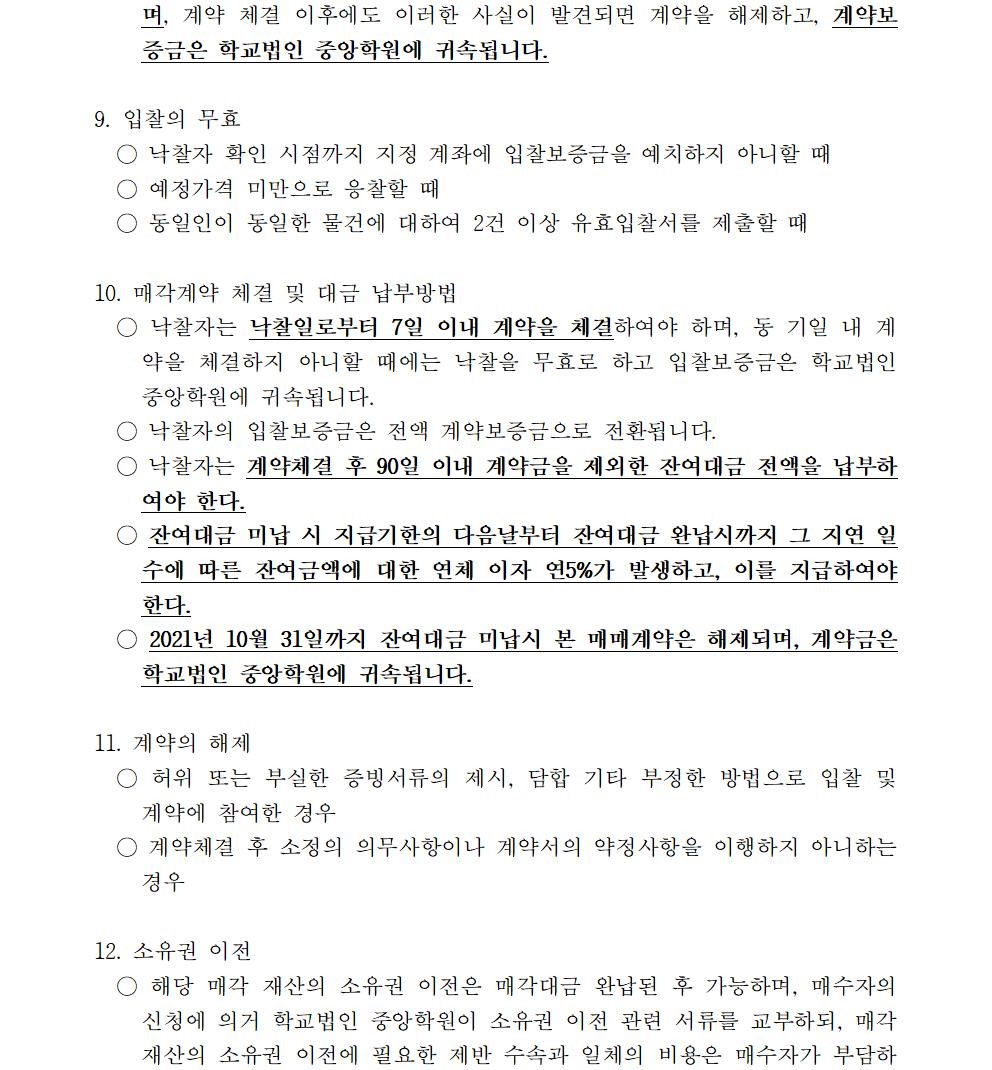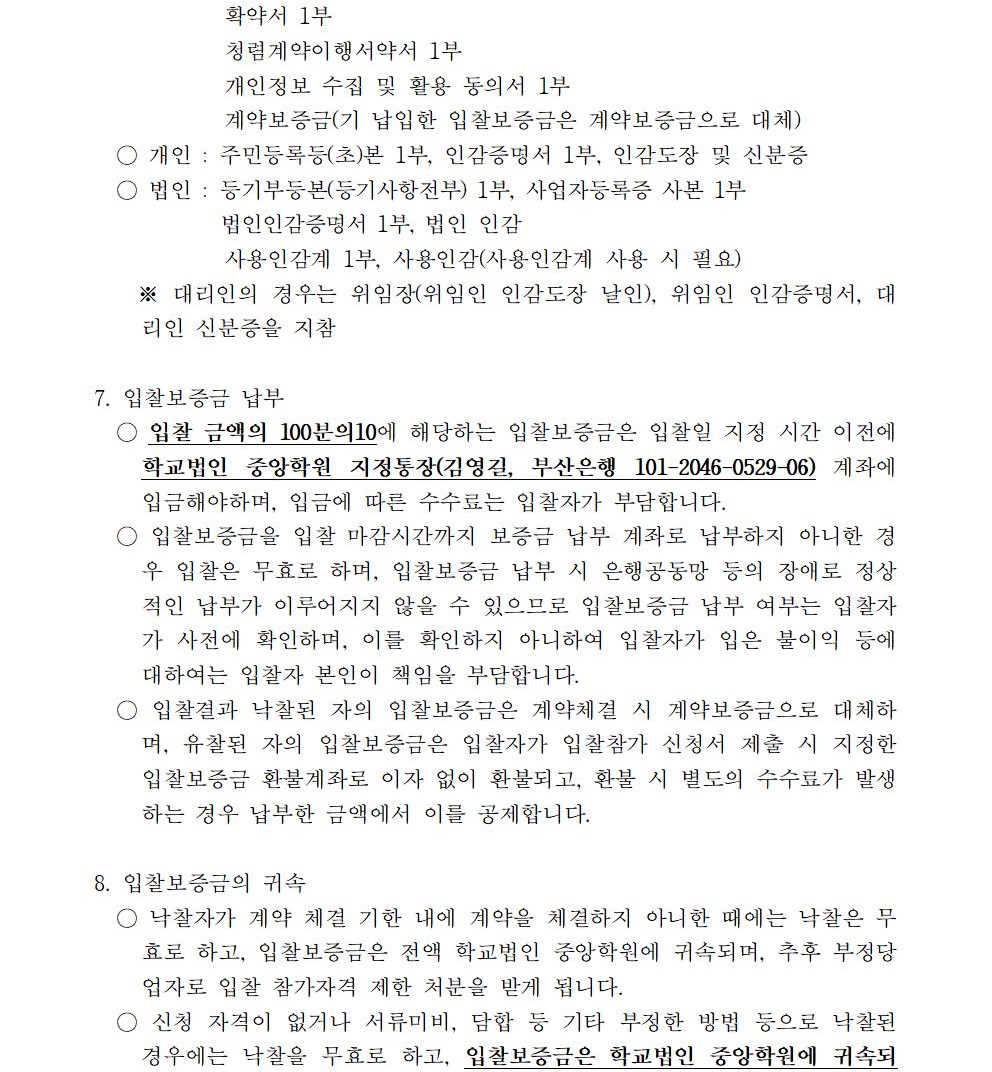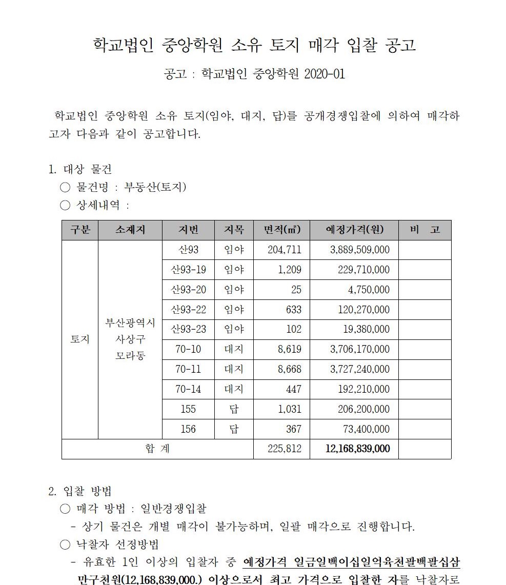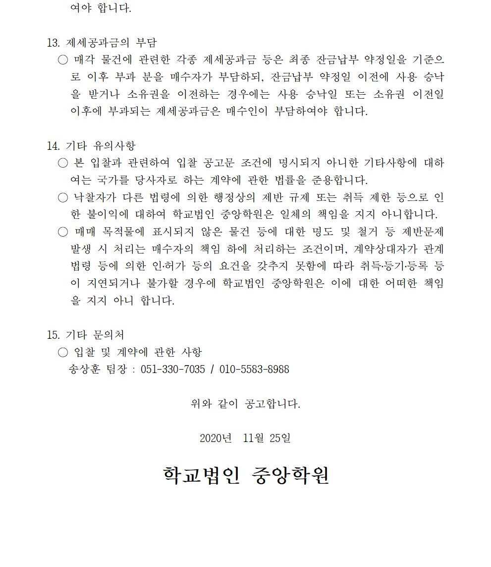 HOME > 기타 > 입찰/채용 입찰/채용 제목 [입찰] 학교법인 중앙학원 소유 토지 매각 입찰 공고 등록일 2020.11.25 12:11:29 작성자 행정지원처 첨부파일 붙임1 매각공고문.pdf [73.25 KB]붙임2 안내문.pdf [503.97 KB]붙임3. 입찰참사 서류 양식.zip [161.64 KB] 조회 2931 이전글 [입찰] 대학혁신지원사업 기자재(치기공용 테이블 등) 구입 입찰(긴급) 다음글 [입찰] 사회맞춤형 기자재 (에어히팅장비 등) 구입 입찰 목록 비밀글 비밀번호 입력 폼 비밀번호 입력 비밀번호를 입력하여 주세요. 관리자는 확인버튼만 누르시면 됩니다. 비밀번호 잘못된 비밀번호입니다. 비밀번호를 다시 입력해주세요. 확인