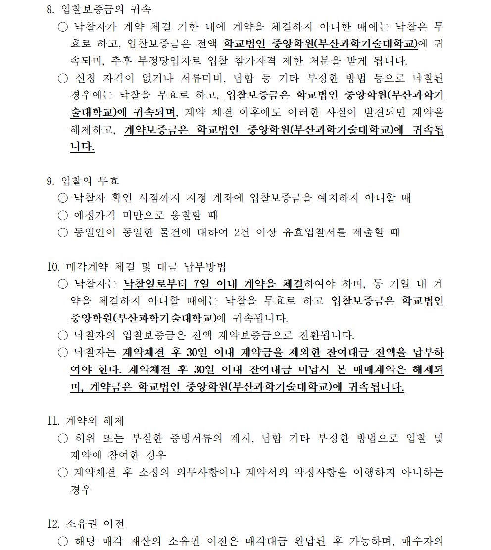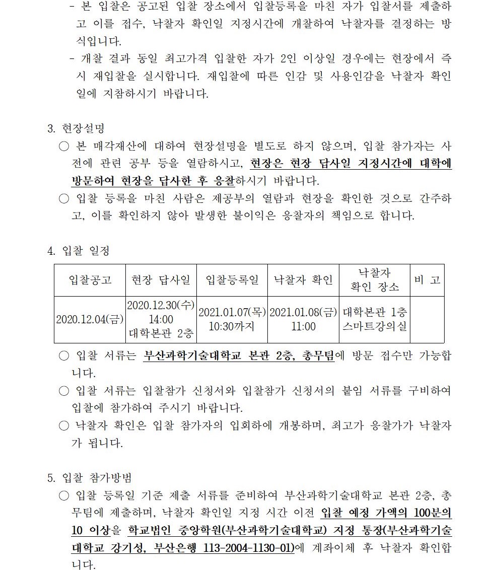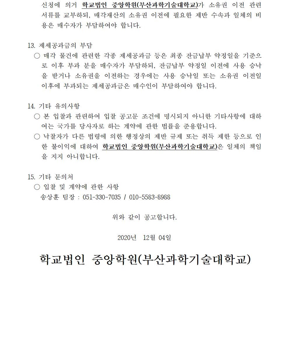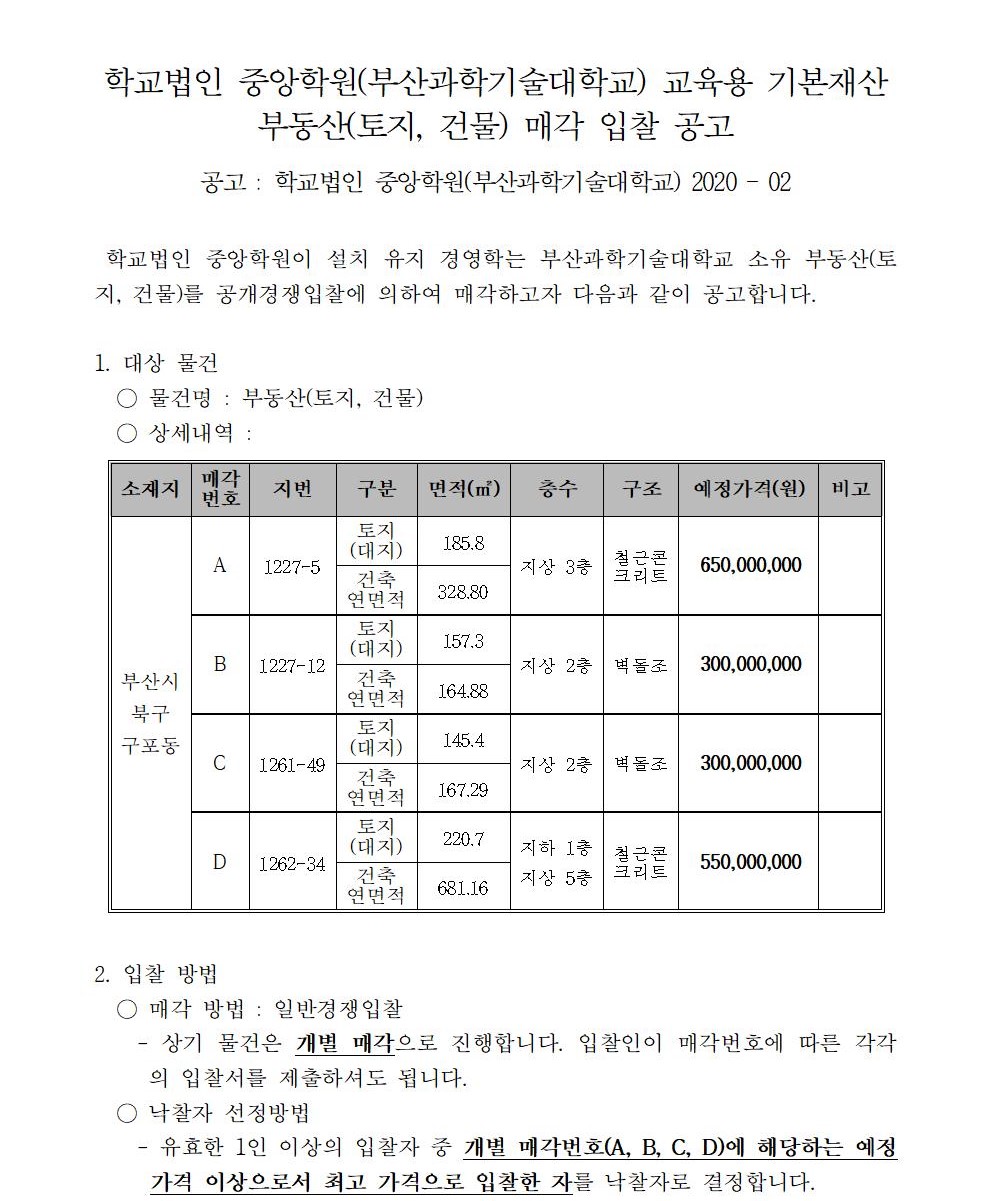 HOME > 기타 > 입찰/채용 입찰/채용 제목 [입찰] 학교법인 중앙학원(부산과학기술대학교) 교육용기본재산 부동산(토지, 건물) 매각 입찰 공고 등록일 2020.12.04 11:12:15 작성자 행정지원처 첨부파일 붙임3. 입찰참가 서류 양식.zip [163.53 KB]붙임2 안내문.pdf [625.12 KB]붙임1 매각공고문.pdf [84.95 KB] 조회 3126 이전글 [입찰] 사회맞춤형 / 대학혁신 실습실 환경개선공사 입찰 다음글 [채용] 대학 온라인 원격 교육지원 계약직 직원 추가 공고 목록 비밀글 비밀번호 입력 폼 비밀번호 입력 비밀번호를 입력하여 주세요. 관리자는 확인버튼만 누르시면 됩니다. 비밀번호 잘못된 비밀번호입니다. 비밀번호를 다시 입력해주세요. 확인