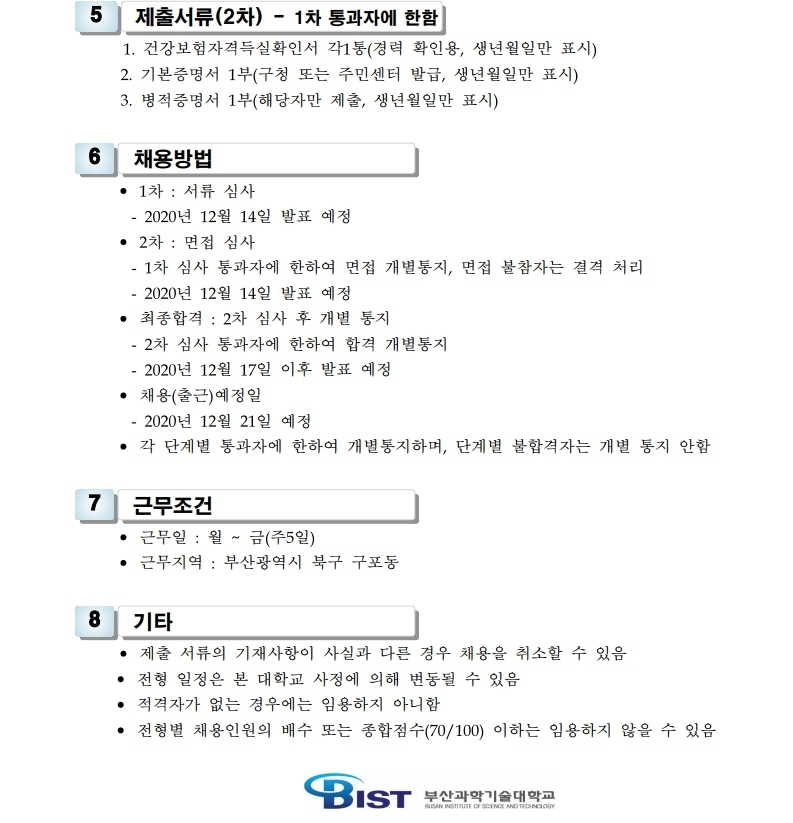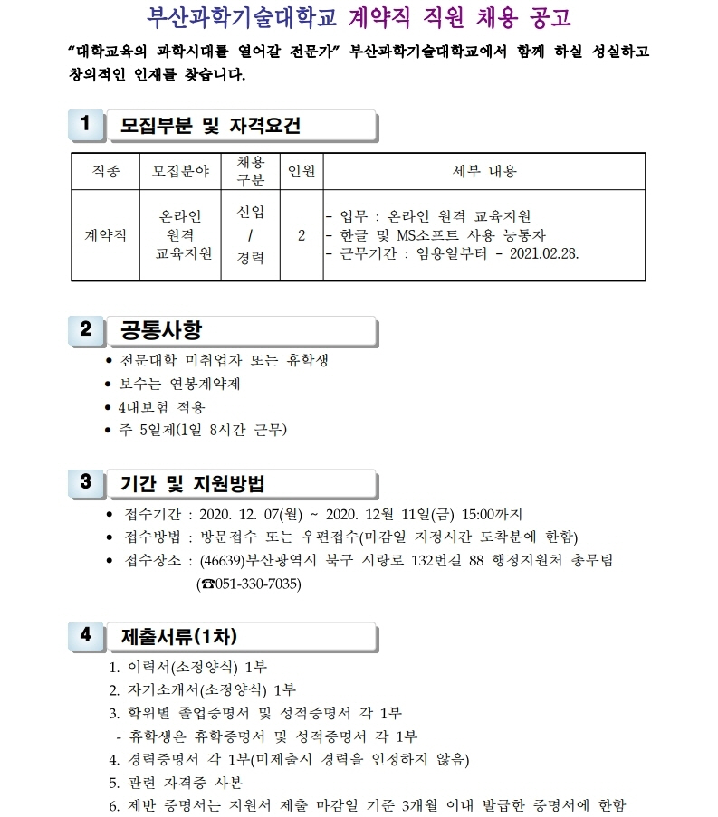 HOME > 기타 > 입찰/채용 입찰/채용 제목 [채용] 대학 온라인 원격 교육지원 계약직 직원 추가 공고 등록일 2020.12.07 09:49:19 작성자 행정지원처 첨부파일 1-3. 지원서 및 자기소개서(계약직).hwp [23.00 KB]1-2. 공고문(온라인도우미).pdf [178.54 KB] 조회 3286 이전글 [입찰] 학교법인 중앙학원(부산과학기술대학교) 교육용기본재산 부동산(토지, 건물) 매각 입찰 공고 다음글 [채용] 2021학년도 1학기 비정년 전임교원 초빙 공고 목록 비밀글 비밀번호 입력 폼 비밀번호 입력 비밀번호를 입력하여 주세요. 관리자는 확인버튼만 누르시면 됩니다. 비밀번호 잘못된 비밀번호입니다. 비밀번호를 다시 입력해주세요. 확인