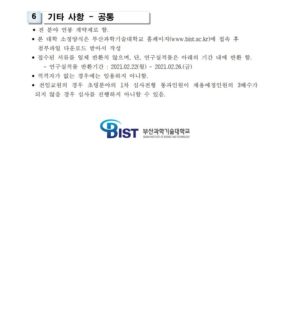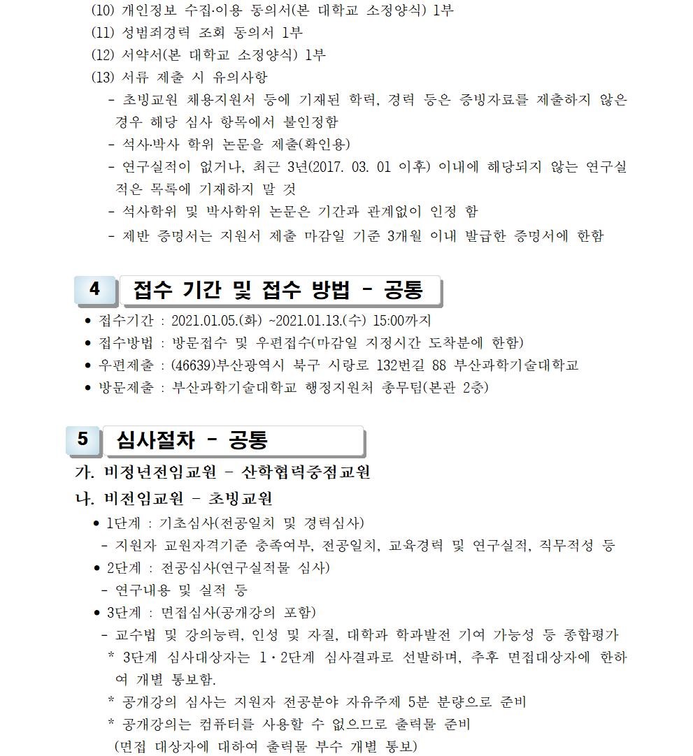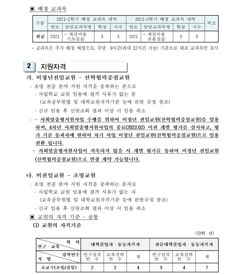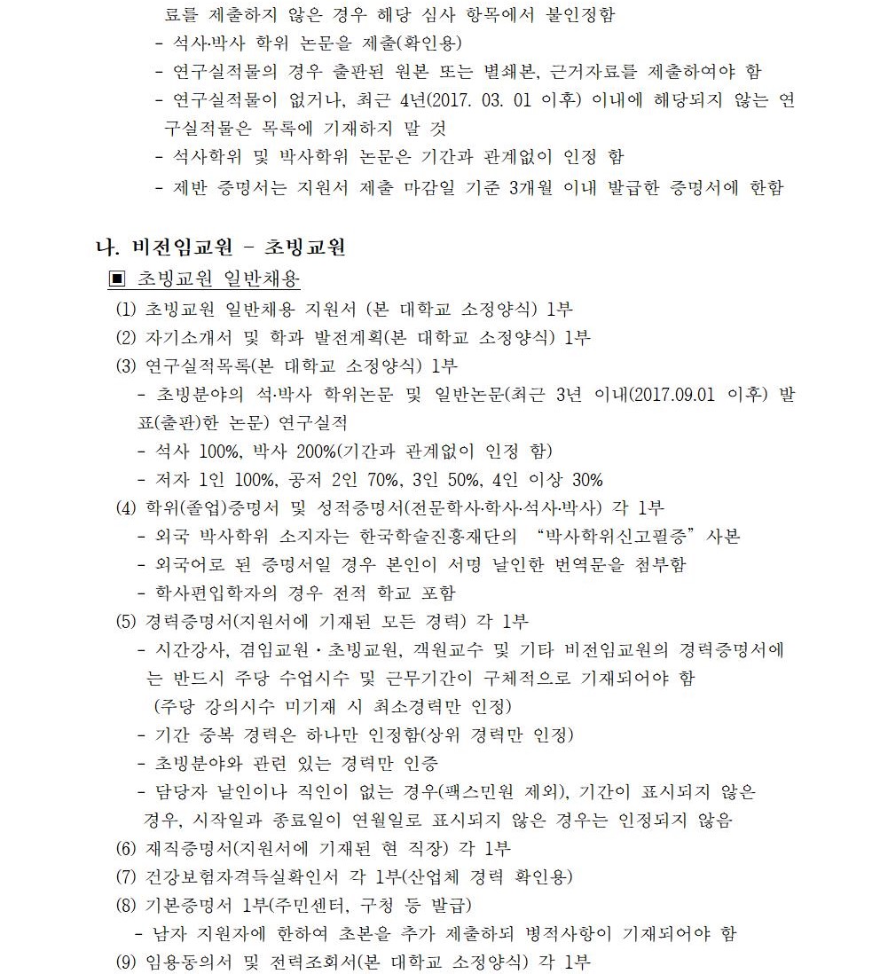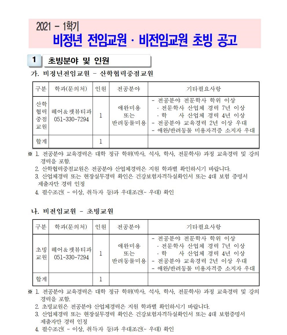 HOME > 기타 > 입찰/채용 입찰/채용 제목 [채용] 2021학년도 1학기 비정년전임교원, 비전임교원 초빙 공고 등록일 2020.12.30 09:12:57 작성자 행정지원처 첨부파일 1-1-3-가. 신규임용계획(공고문).pdf [189.64 KB]1-1-3-가. 교원신규임용 구비서류.zip [57.11 KB] 조회 3397 이전글 [입찰] 대학혁신 실습실 환경개선공사 입찰(긴급) 다음글 [채용] 산학협력단 기술사관육성사업 전담 계약직 직원 채용 목록 비밀글 비밀번호 입력 폼 비밀번호 입력 비밀번호를 입력하여 주세요. 관리자는 확인버튼만 누르시면 됩니다. 비밀번호 잘못된 비밀번호입니다. 비밀번호를 다시 입력해주세요. 확인