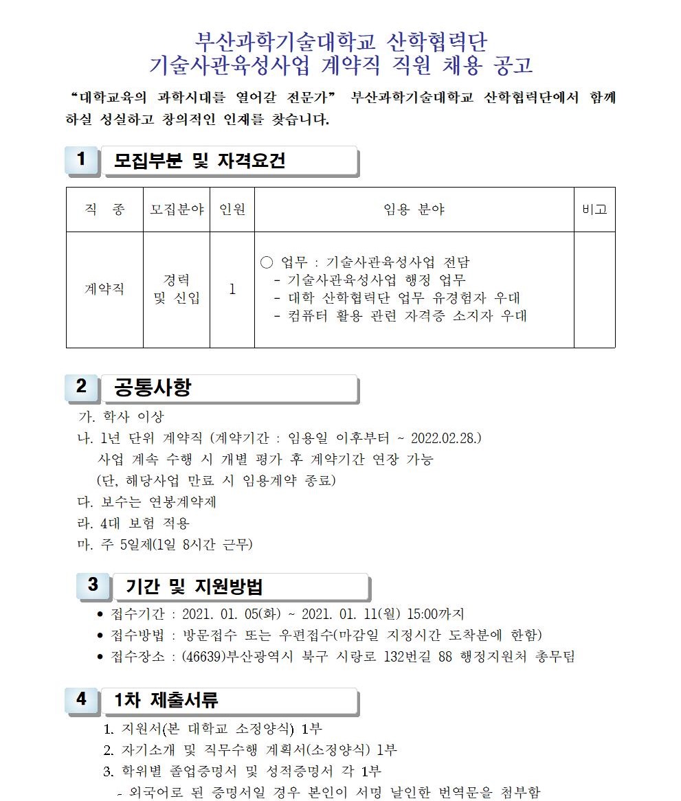 HOME > 기타 > 입찰/채용 입찰/채용 제목 [채용] 산학협력단 기술사관육성사업 전담 계약직 직원 채용 등록일 2020.12.31 09:33:07 작성자 행정지원처 첨부파일 1-3. 지원서 및 자기소개서(계약직).hwp [20.50 KB]1-2. 공고문(계약직).pdf [182.54 KB] 조회 2827 이전글 [채용] 2021학년도 1학기 비정년전임교원, 비전임교원 초빙 공고 다음글 [채용] 2021학년도 1학기 교원(강사) 초빙 공고 목록 비밀글 비밀번호 입력 폼 비밀번호 입력 비밀번호를 입력하여 주세요. 관리자는 확인버튼만 누르시면 됩니다. 비밀번호 잘못된 비밀번호입니다. 비밀번호를 다시 입력해주세요. 확인