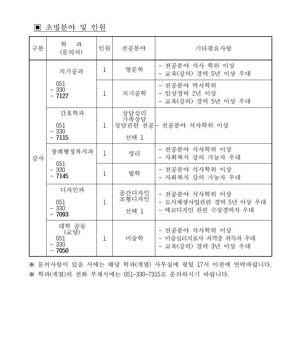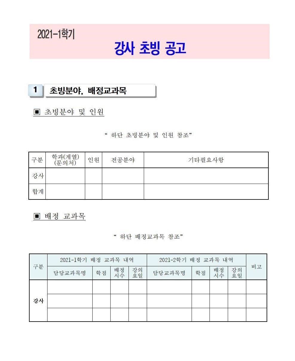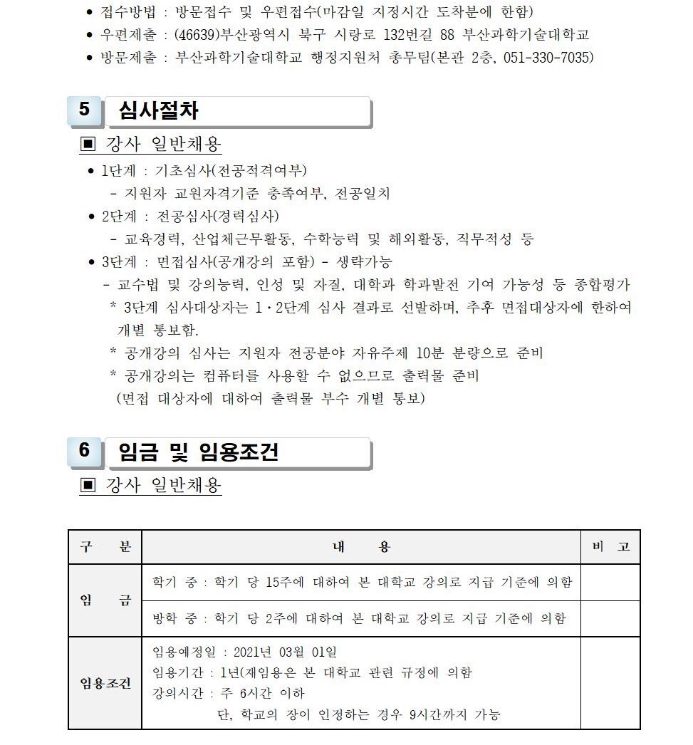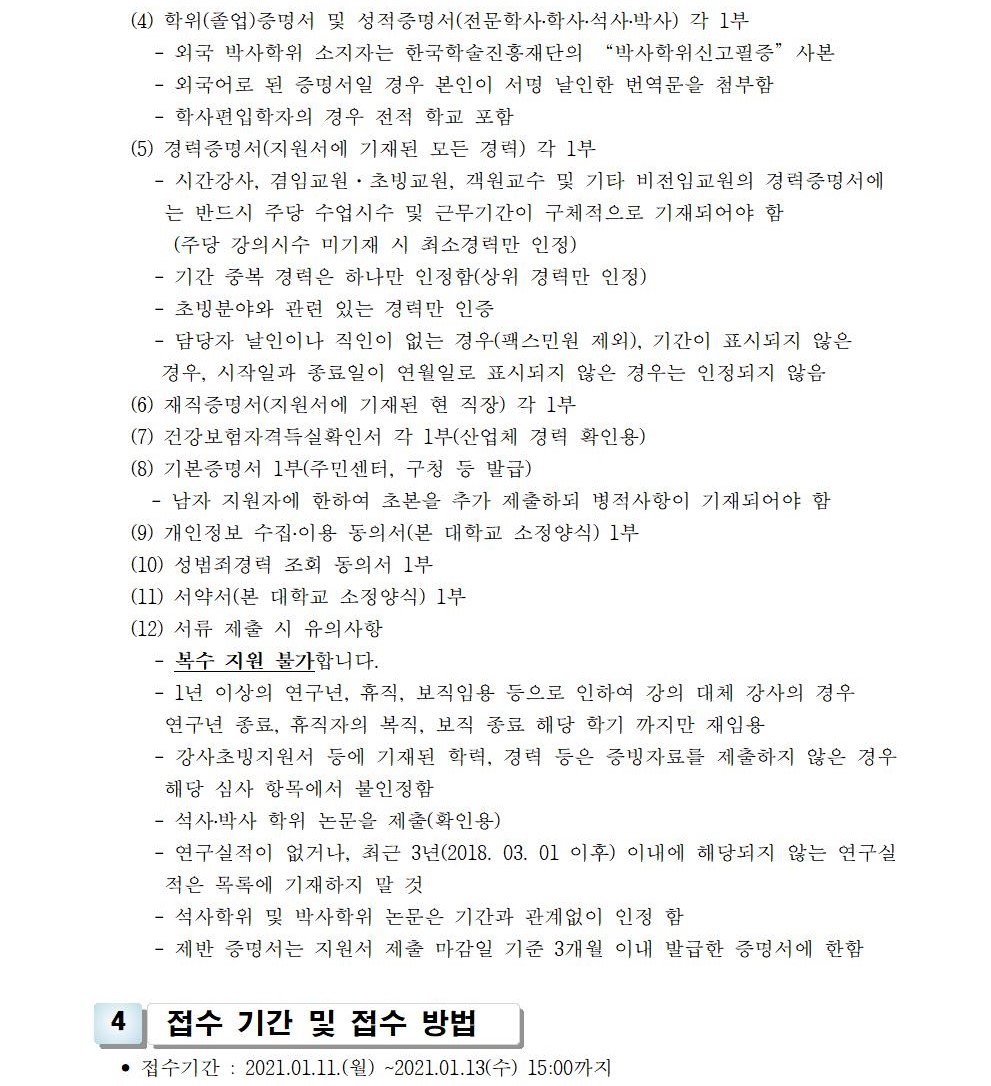 HOME > 기타 > 입찰/채용 입찰/채용 제목 [채용] 2021학년도 1학기 교원(강사) 초빙 공고 등록일 2021.01.06 09:01:41 작성자 행정지원처 첨부파일 1-1-3-가-1. 강사신규임용계획(공고문).pdf [195.97 KB]1-1-5. 강사일반채용 구비서류-2021(공고).zip [54.93 KB] 조회 3293 이전글 [채용] 산학협력단 기술사관육성사업 전담 계약직 직원 채용 다음글 [채용] 2021학년도 1학기 비정년전임교원, 비전임교원 초빙 공고(2차) 목록 비밀글 비밀번호 입력 폼 비밀번호 입력 비밀번호를 입력하여 주세요. 관리자는 확인버튼만 누르시면 됩니다. 비밀번호 잘못된 비밀번호입니다. 비밀번호를 다시 입력해주세요. 확인