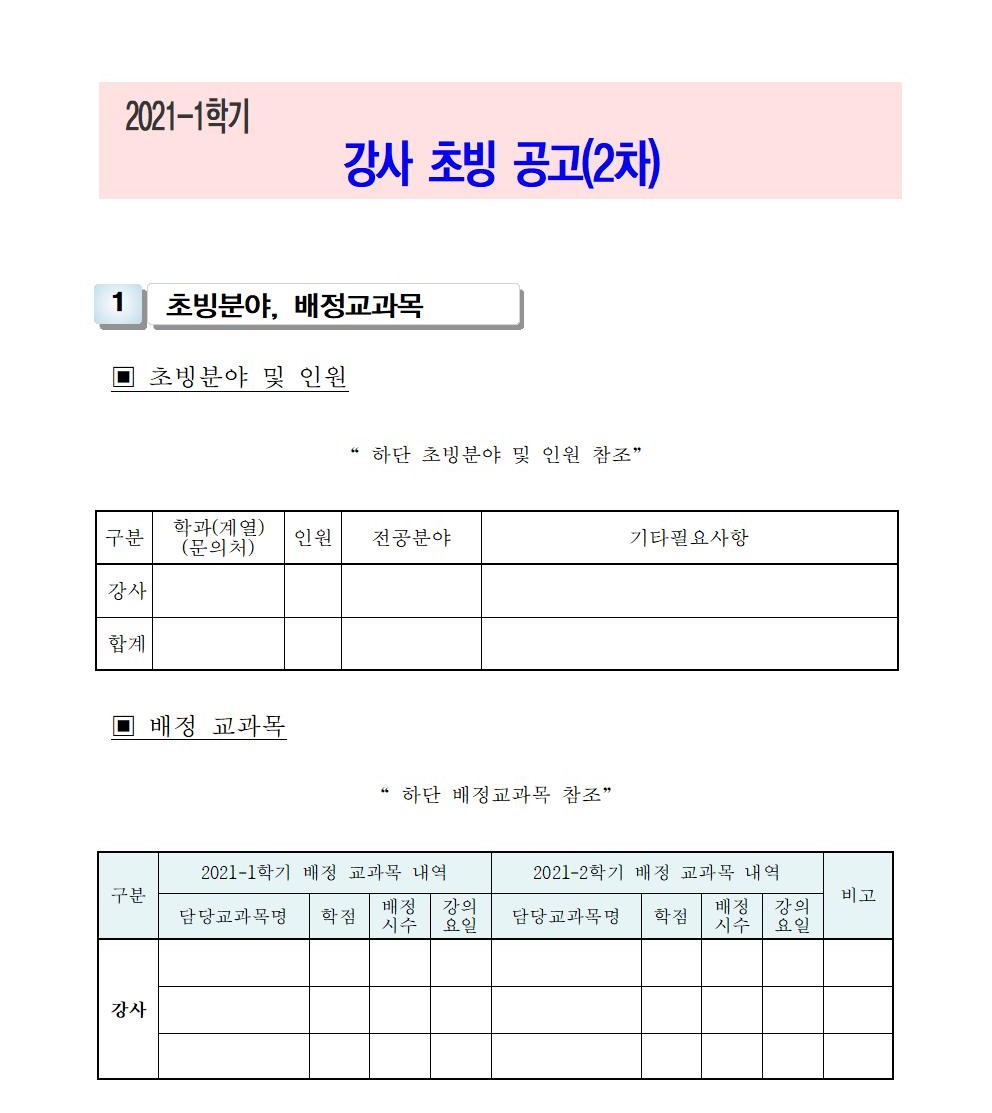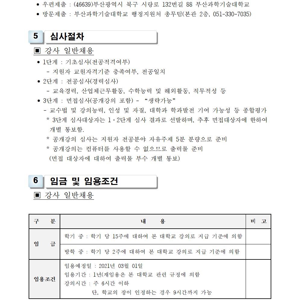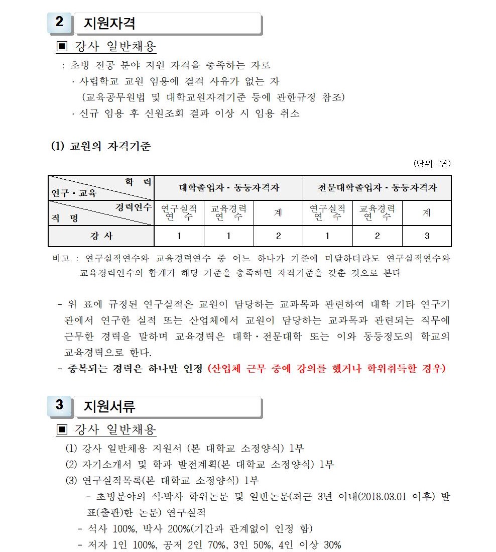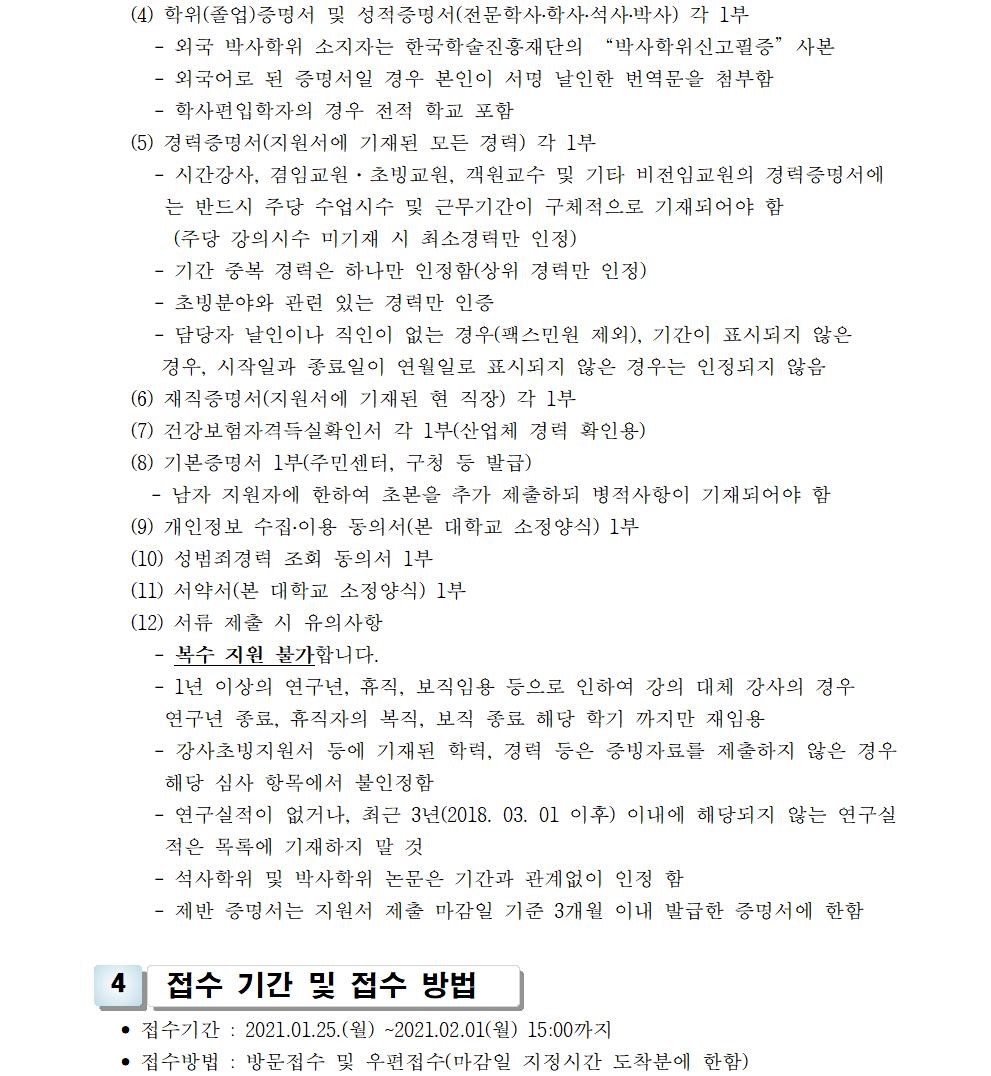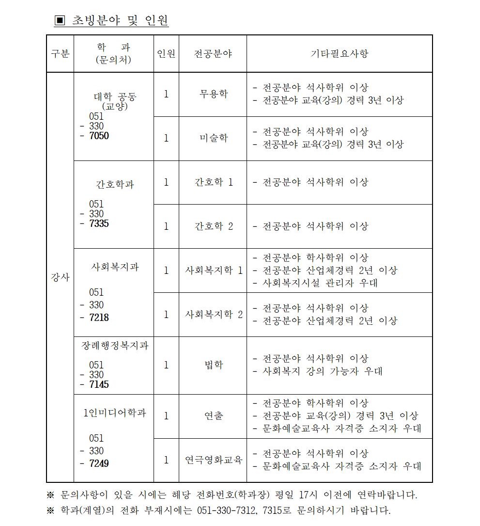 HOME > 기타 > 입찰/채용 입찰/채용 제목 [채용] 2021학년도 1학기 교원(강사) 초빙 공고(2차) 등록일 2021.01.25 11:01:52 작성자 행정지원처 첨부파일 1-1-3-가-1. 강사신규임용계획(공고문).pdf [194.13 KB]1-1-5. 강사일반채용 구비서류-2021(공고)-2차.zip [54.96 KB] 조회 2966 이전글 [채용] 산학협력단 기술사관육성사업 전담 계약직 직원 채용 다음글 [입찰] 대학혁신지원사업 기자재(컴퓨터 등) 구입 입찰(긴급) 목록 비밀글 비밀번호 입력 폼 비밀번호 입력 비밀번호를 입력하여 주세요. 관리자는 확인버튼만 누르시면 됩니다. 비밀번호 잘못된 비밀번호입니다. 비밀번호를 다시 입력해주세요. 확인