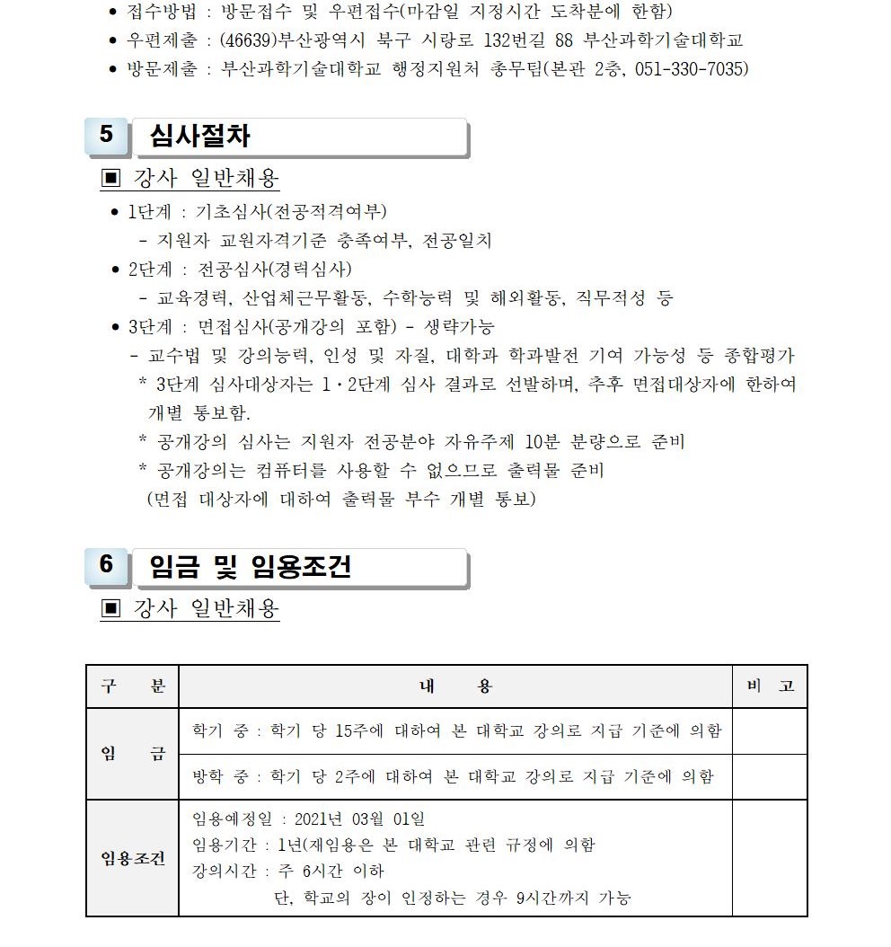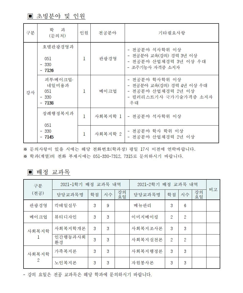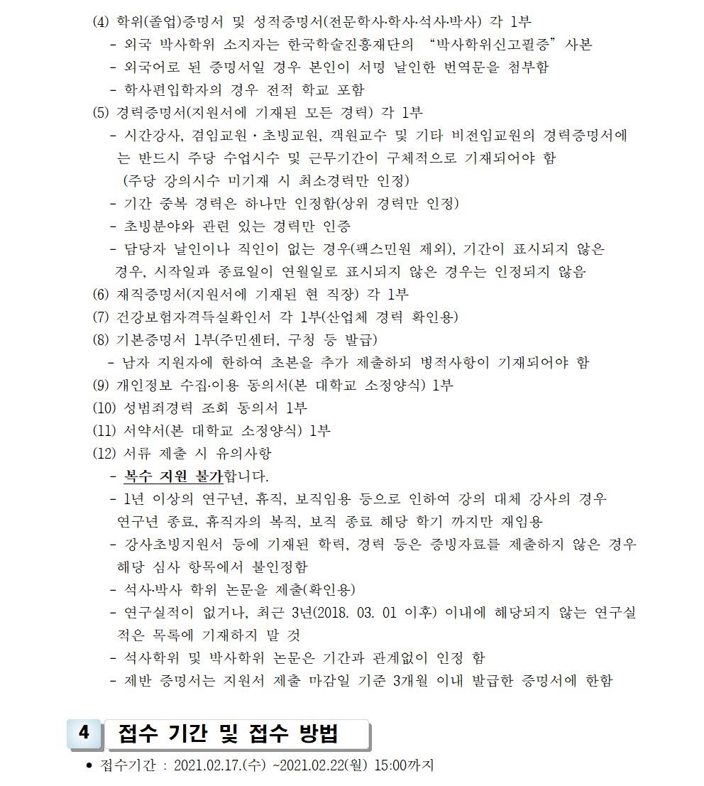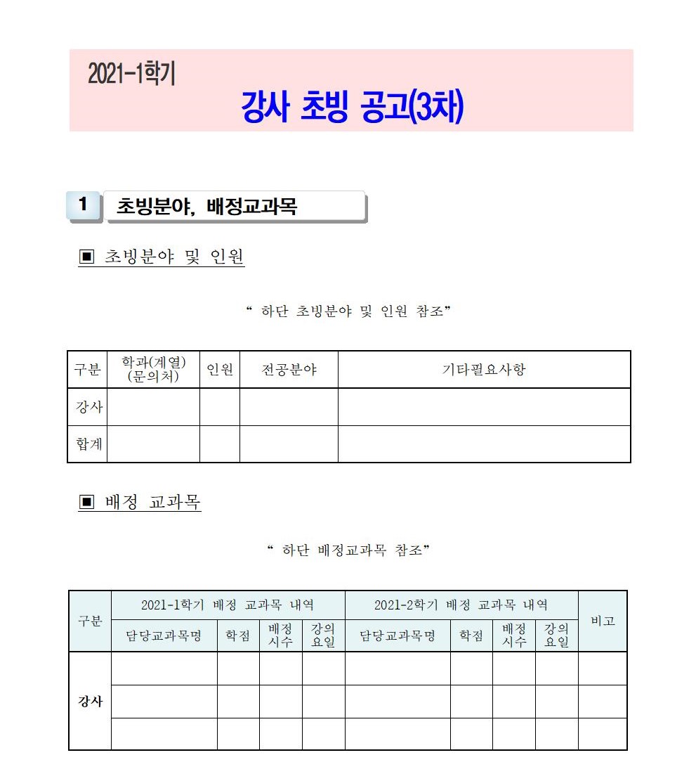 HOME > 기타 > 입찰/채용 입찰/채용 제목 [채용] 2021학년도 1학기 교원(강사) 초빙 공고(3차) 등록일 2021.02.16 10:02:19 작성자 행정지원처 첨부파일 1-1-3-가-1. 강사신규임용계획(공고문).pdf [195.32 KB]1-1-5. 강사일반채용 구비서류-2021(공고)-3차.zip [55.25 KB] 조회 3062 이전글 [입찰] 사회맞춤형 기자재(일체형컴퓨터) 구입 입찰(긴급) 다음글 [채용] 산학협력단 대학혁신지원사업 전담 계약직 직원 채용 공고 목록 비밀글 비밀번호 입력 폼 비밀번호 입력 비밀번호를 입력하여 주세요. 관리자는 확인버튼만 누르시면 됩니다. 비밀번호 잘못된 비밀번호입니다. 비밀번호를 다시 입력해주세요. 확인