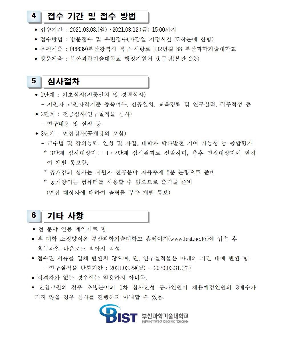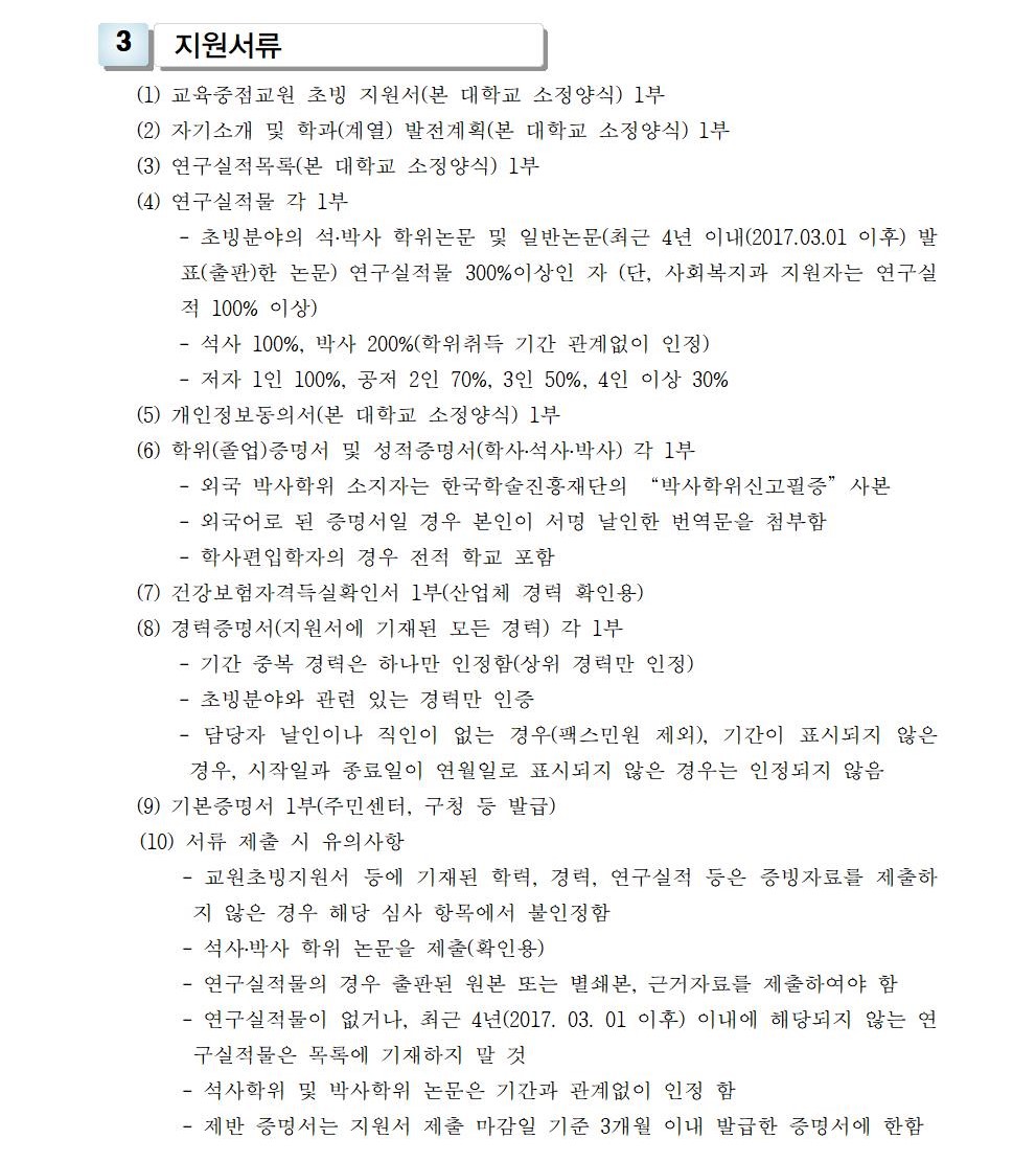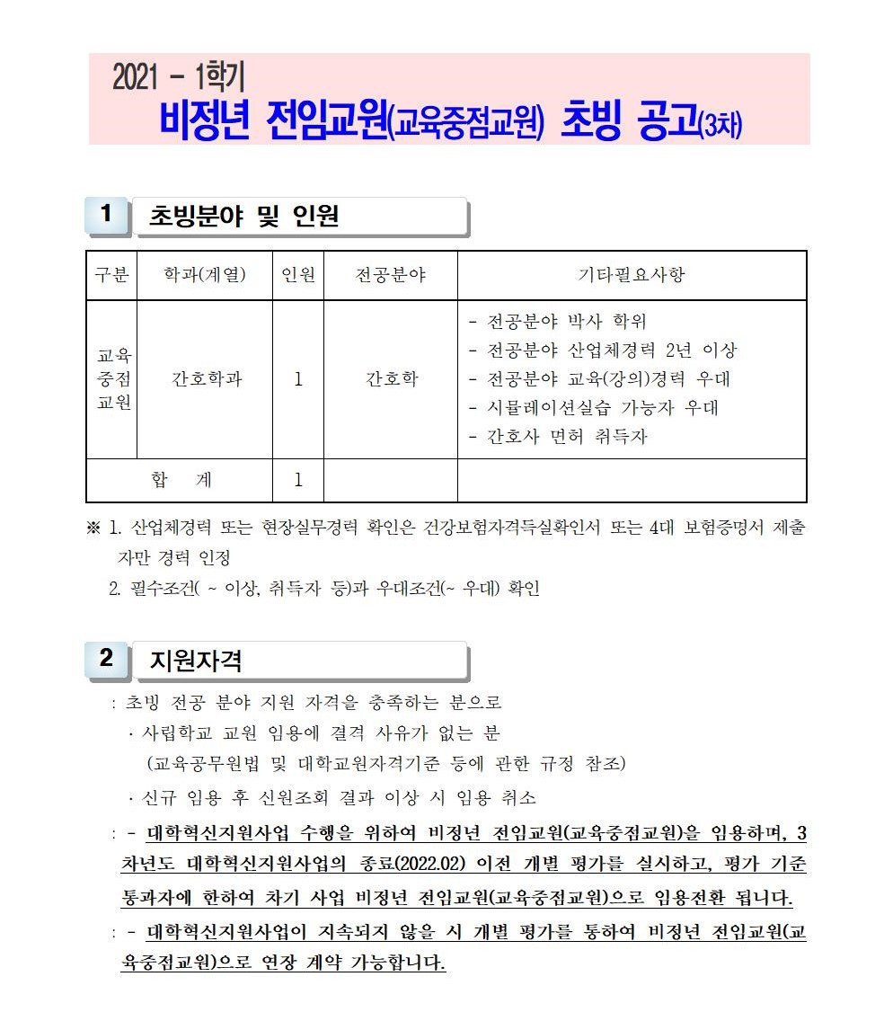 HOME > 기타 > 입찰/채용 입찰/채용 제목 [채용] 2021학년도 1학기 비정년전임교원 초빙 공고(3차) 등록일 2021.02.26 08:02:38 작성자 행정지원처 첨부파일 1-1-3-가. 신규임용계획(공고문).pdf [165.35 KB]1-1-3-사. (지원서류) 비정년전임-교육중점교원-3차(간호학과).zip [39.74 KB] 조회 2656 이전글 [채용] 산학협력단 대학혁신지원사업 전담 계약직 직원 채용 공고 다음글 [채용] 2021학년도 1학기 교원(강사) 초빙 공고(4차) 목록 비밀글 비밀번호 입력 폼 비밀번호 입력 비밀번호를 입력하여 주세요. 관리자는 확인버튼만 누르시면 됩니다. 비밀번호 잘못된 비밀번호입니다. 비밀번호를 다시 입력해주세요. 확인