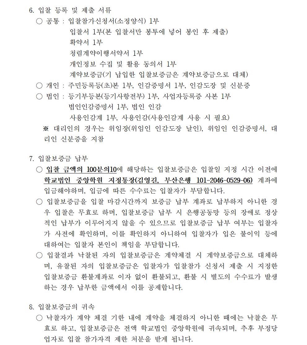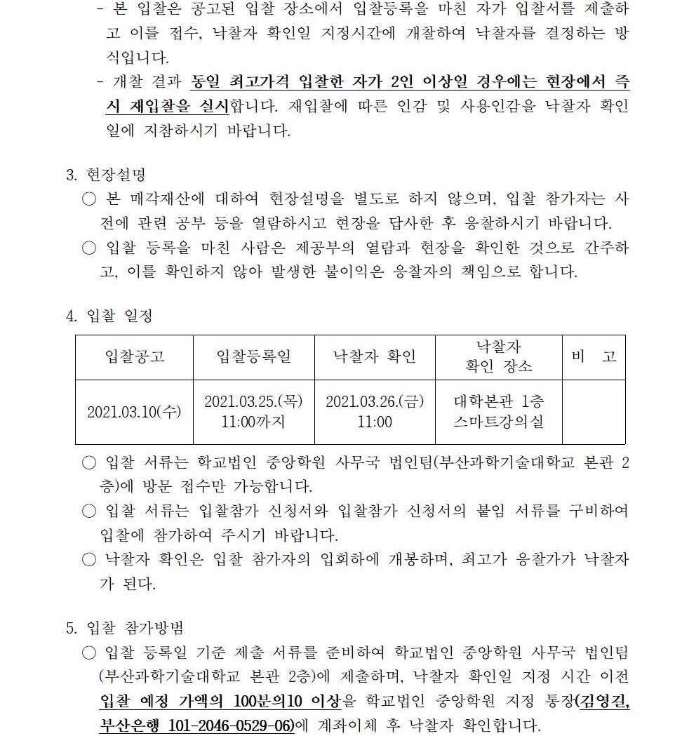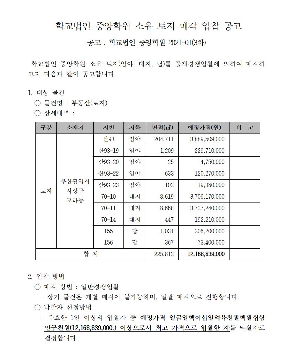 HOME > 기타 > 입찰/채용 입찰/채용 제목 [입찰] 학교법인 중앙학원 소유 토지 매각 입찰 공고(3차) 등록일 2021.03.10 10:03:14 작성자 행정지원처 첨부파일 붙임9. 입찰참가 서류 양식(3차).zip [713.62 KB] 조회 2708 이전글 [채용] 산학협력단 기술사관육성사업 전담 계약직 직원 채용 다음글 [입찰] 학교법인 중앙학원(부산과학기술대학교) 교육용기본재산 부동산(토지, 건물) 매각 입찰 공고(2차) 목록 비밀글 비밀번호 입력 폼 비밀번호 입력 비밀번호를 입력하여 주세요. 관리자는 확인버튼만 누르시면 됩니다. 비밀번호 잘못된 비밀번호입니다. 비밀번호를 다시 입력해주세요. 확인