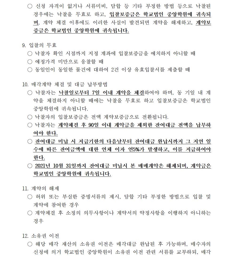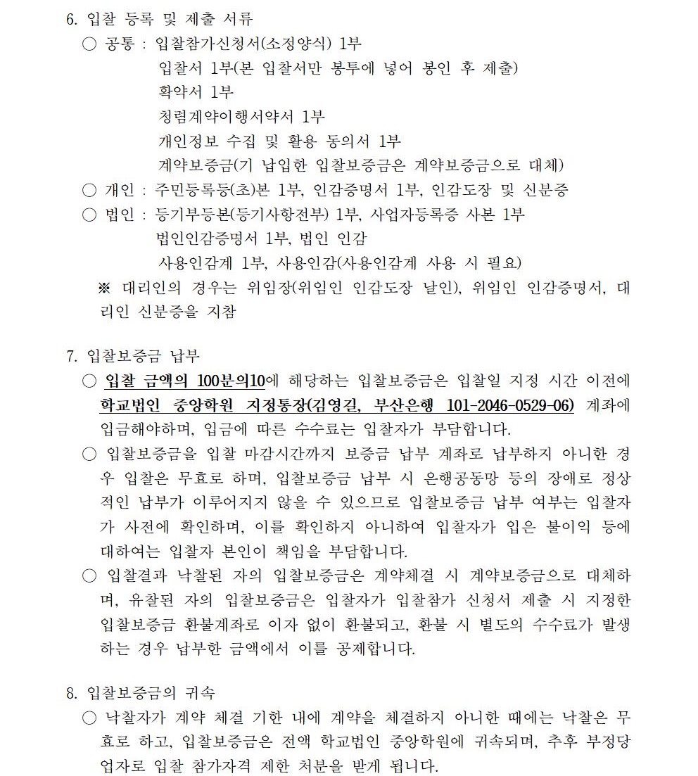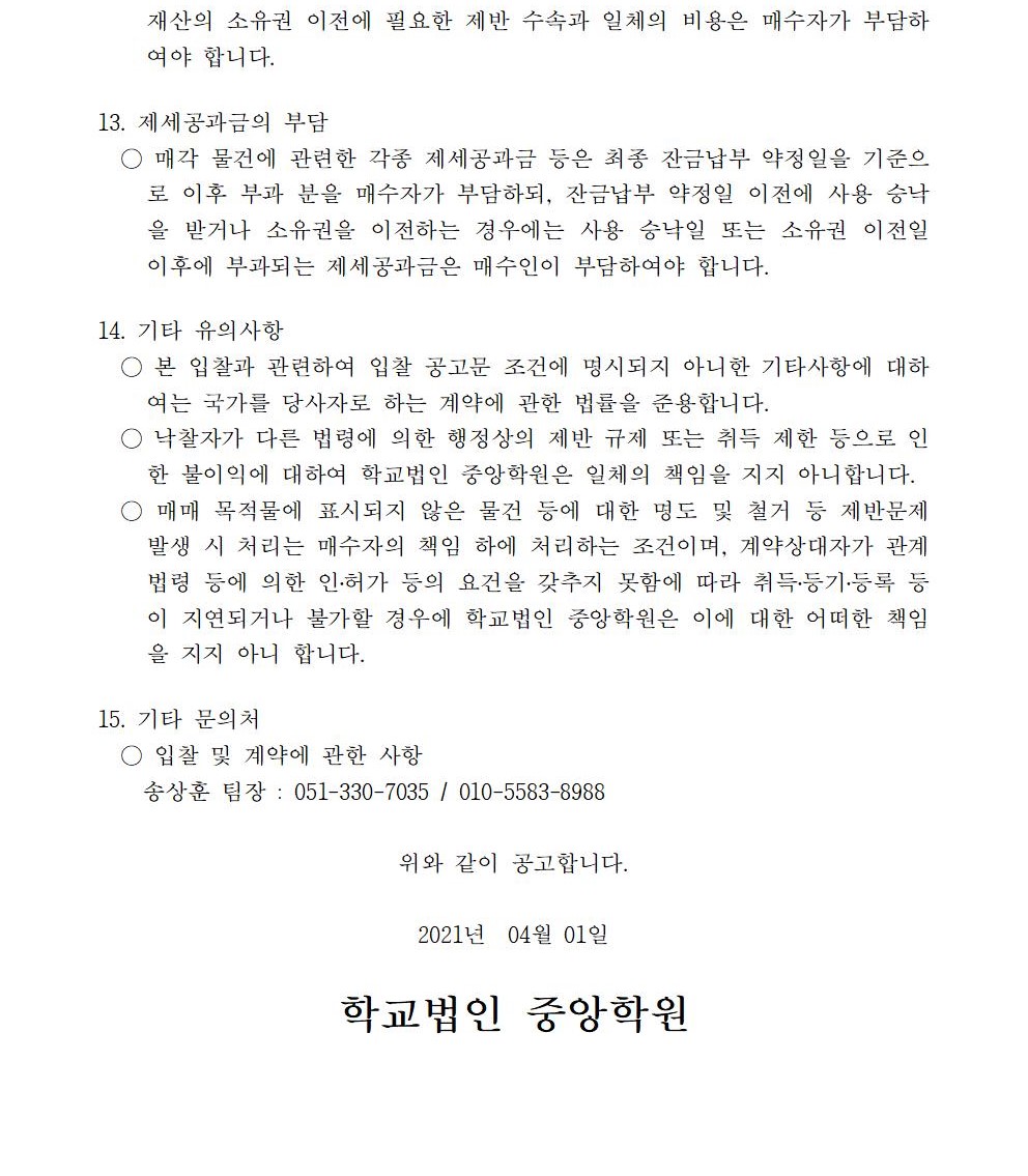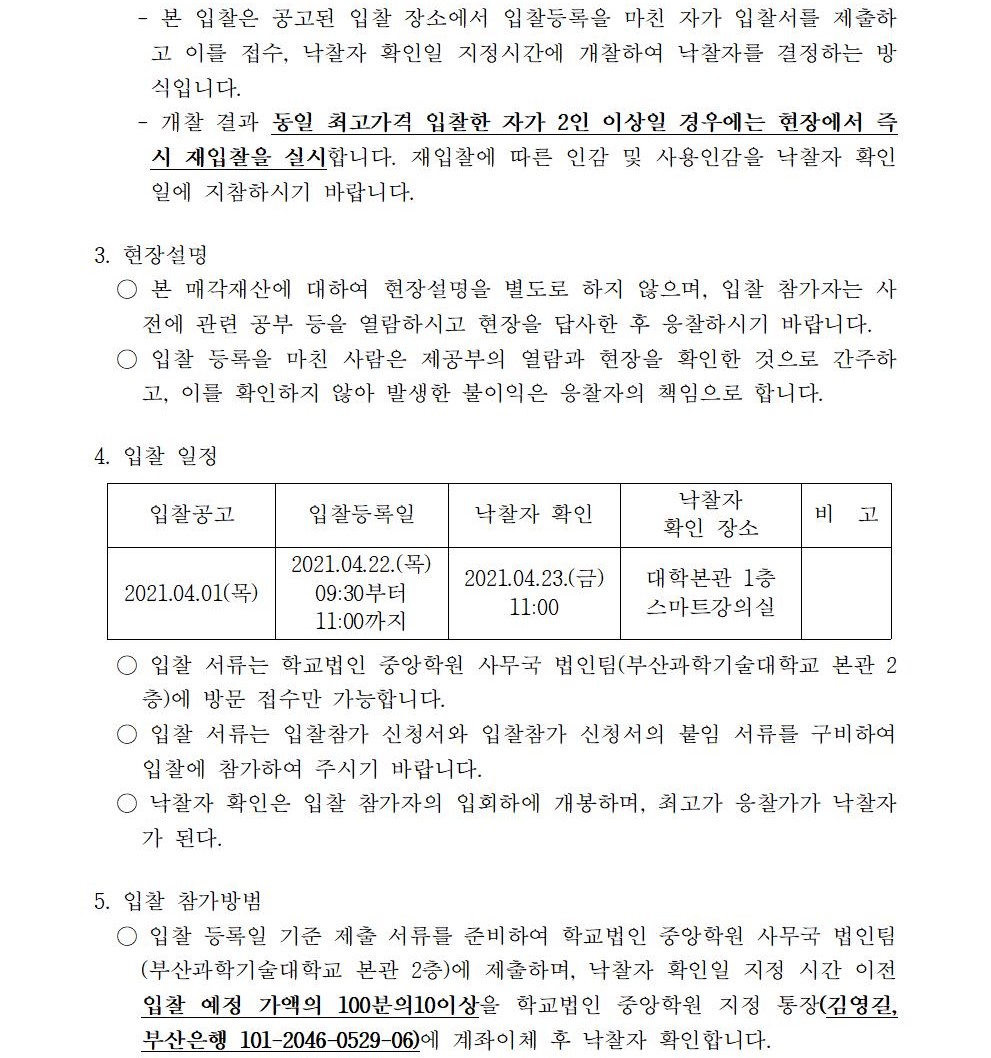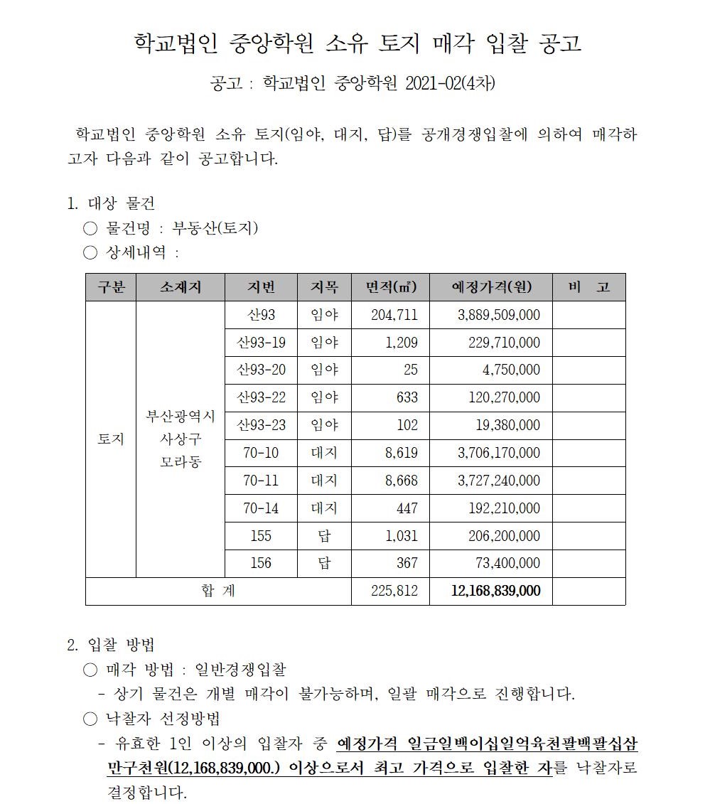 HOME > 기타 > 입찰/채용 입찰/채용 제목 [입찰] 학교법인 중앙학원 소유 토지 매각 입찰 공고(4차) 등록일 2021.04.01 14:04:38 작성자 행정지원처 첨부파일 붙임1 매각공고문.pdf [72.91 KB]붙임9. 입찰참가 서류 양식(4차).zip [714.00 KB] 조회 2428 이전글 [입찰] 대학일자리센터 진로직무매칭시스템 운영 용역(협상에 의한 계약) 입찰 공고(긴급) 다음글 [입찰] 학교법인 중앙학원(부산과학기술대학교) 교육용기본재산 부동산(토지, 건물) 매각 입찰 공고(3차) 목록 비밀글 비밀번호 입력 폼 비밀번호 입력 비밀번호를 입력하여 주세요. 관리자는 확인버튼만 누르시면 됩니다. 비밀번호 잘못된 비밀번호입니다. 비밀번호를 다시 입력해주세요. 확인