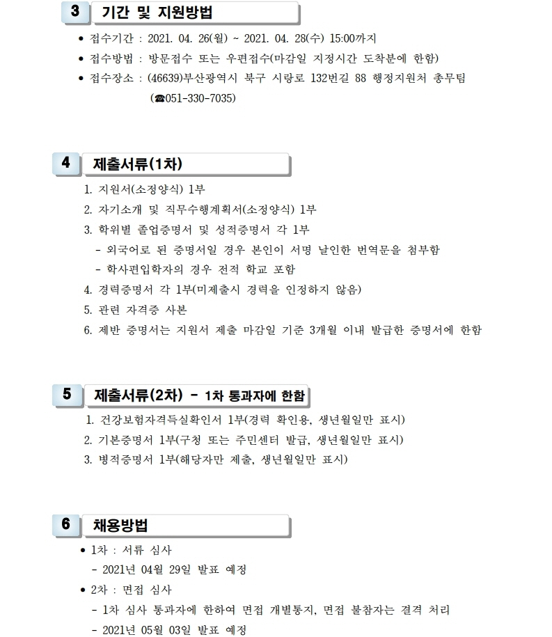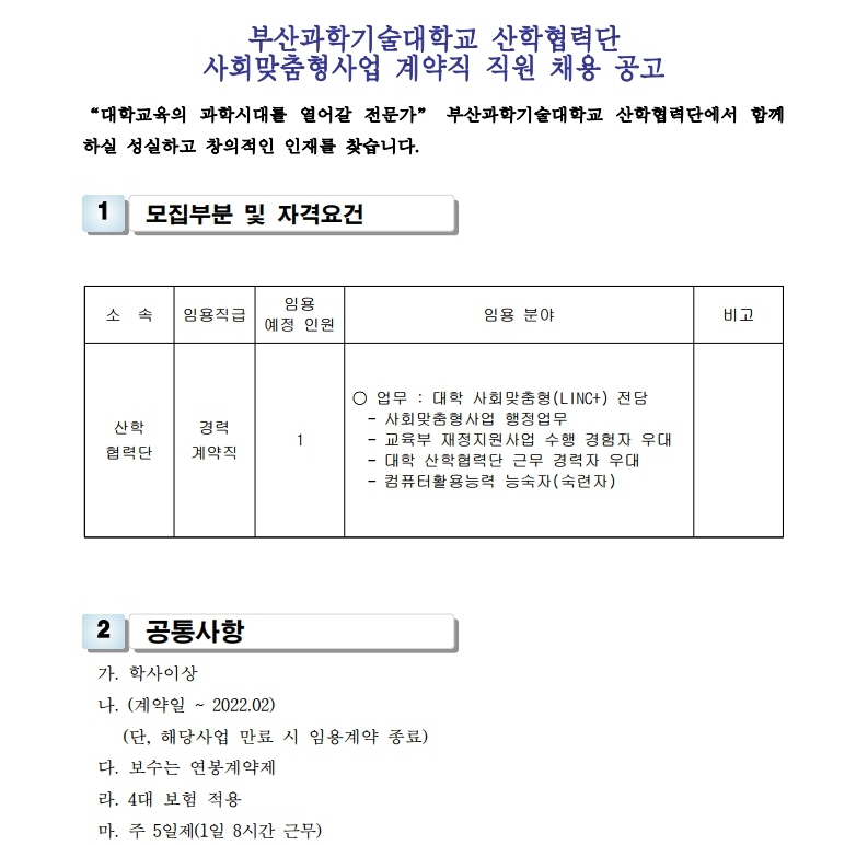 HOME > 기타 > 입찰/채용 입찰/채용 제목 [채용] 사회맞춤형사업(LINC+) 계약직 직원 채용 공고 등록일 2021.04.15 10:04:23 작성자 행정지원처 첨부파일 1-2. 공고문(계약직).pdf [176.53 KB]1-3. 지원서 및 자기소개서(계약직).hwp [64.00 KB] 조회 2414 이전글 [입찰] 학교법인 중앙학원(부산과학기술대학교) 교육용기본재산 부동산(토지, 건물) 매각 입찰 공고(3차) 다음글 [채용] 대학일자리센터 계약직 직원 채용 공고 목록 비밀글 비밀번호 입력 폼 비밀번호 입력 비밀번호를 입력하여 주세요. 관리자는 확인버튼만 누르시면 됩니다. 비밀번호 잘못된 비밀번호입니다. 비밀번호를 다시 입력해주세요. 확인