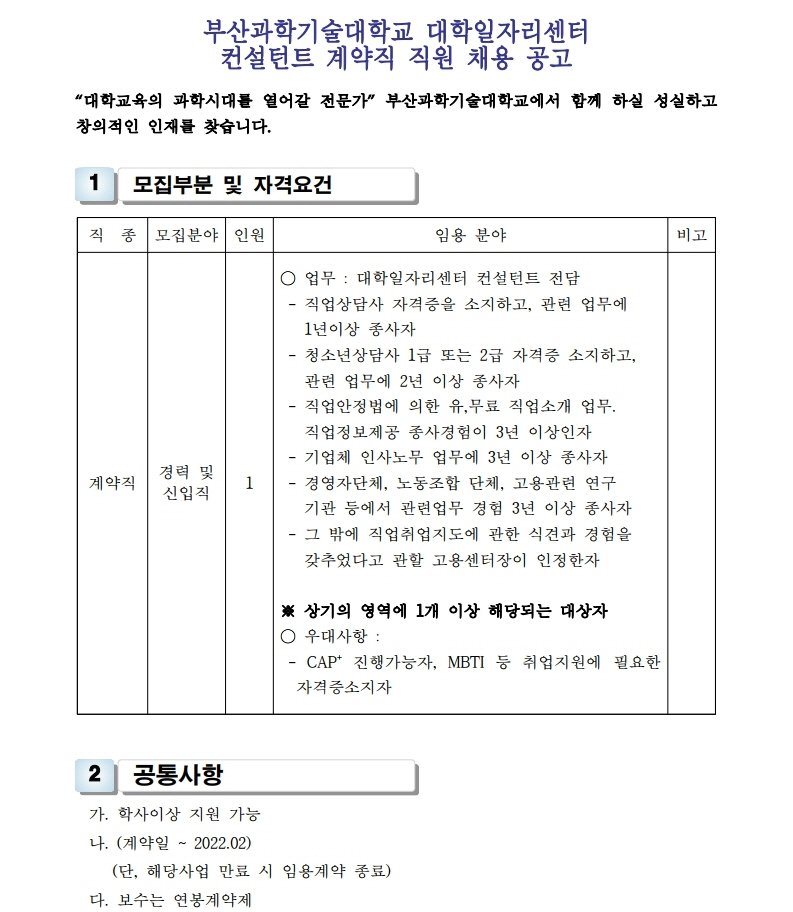 HOME > 기타 > 입찰/채용 입찰/채용 제목 [채용] 대학일자리센터 계약직 직원 채용 공고 등록일 2021.04.15 11:04:02 작성자 행정지원처 첨부파일 1-3. 지원서 및 자기소개서(컨설턴트).hwp [20.50 KB]1-2. 공고문(계약직).pdf [170.76 KB] 조회 2316 이전글 [채용] 사회맞춤형사업(LINC+) 계약직 직원 채용 공고 다음글 [입찰] 대학일자리센터 진로직무매칭시스템 운영 용역(협상에 의한 계약) 입찰 공고(재공고)(긴급) 목록 비밀글 비밀번호 입력 폼 비밀번호 입력 비밀번호를 입력하여 주세요. 관리자는 확인버튼만 누르시면 됩니다. 비밀번호 잘못된 비밀번호입니다. 비밀번호를 다시 입력해주세요. 확인