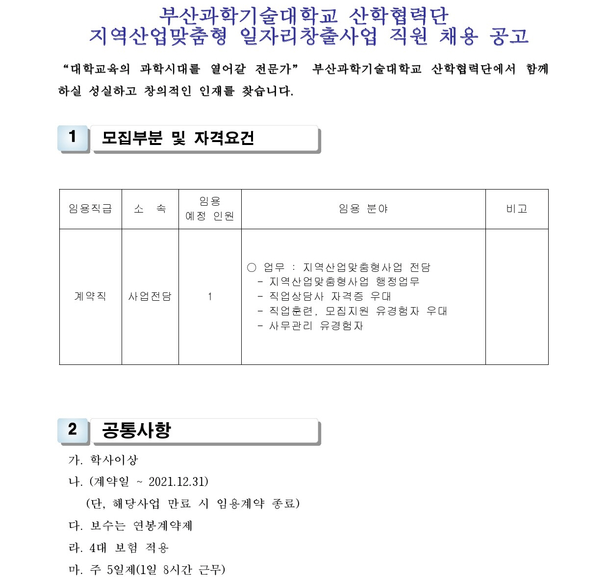 HOME > 기타 > 입찰/채용 입찰/채용 제목 [채용] 지역산업맞춤형 일자리창출사업 계약직 직원 채용 공고 등록일 2021.05.13 09:05:24 작성자 행정지원처 첨부파일 1-3. 지원서 및 자기소개서(계약직).hwp [63.50 KB]1-2. 공고문(계약직).pdf [174.35 KB] 조회 2418 이전글 [채용] 사회맞춤형사업(LINC+) 계약직 직원 채용 공고 다음글 [채용] 대학일자리센터 계약직 직원 채용 공고 목록 비밀글 비밀번호 입력 폼 비밀번호 입력 비밀번호를 입력하여 주세요. 관리자는 확인버튼만 누르시면 됩니다. 비밀번호 잘못된 비밀번호입니다. 비밀번호를 다시 입력해주세요. 확인