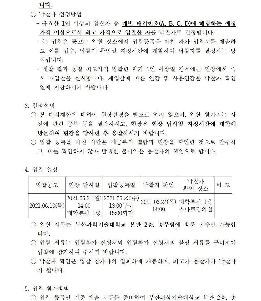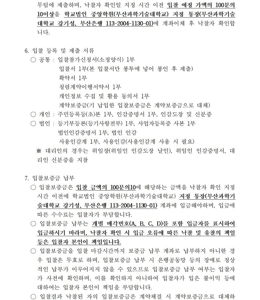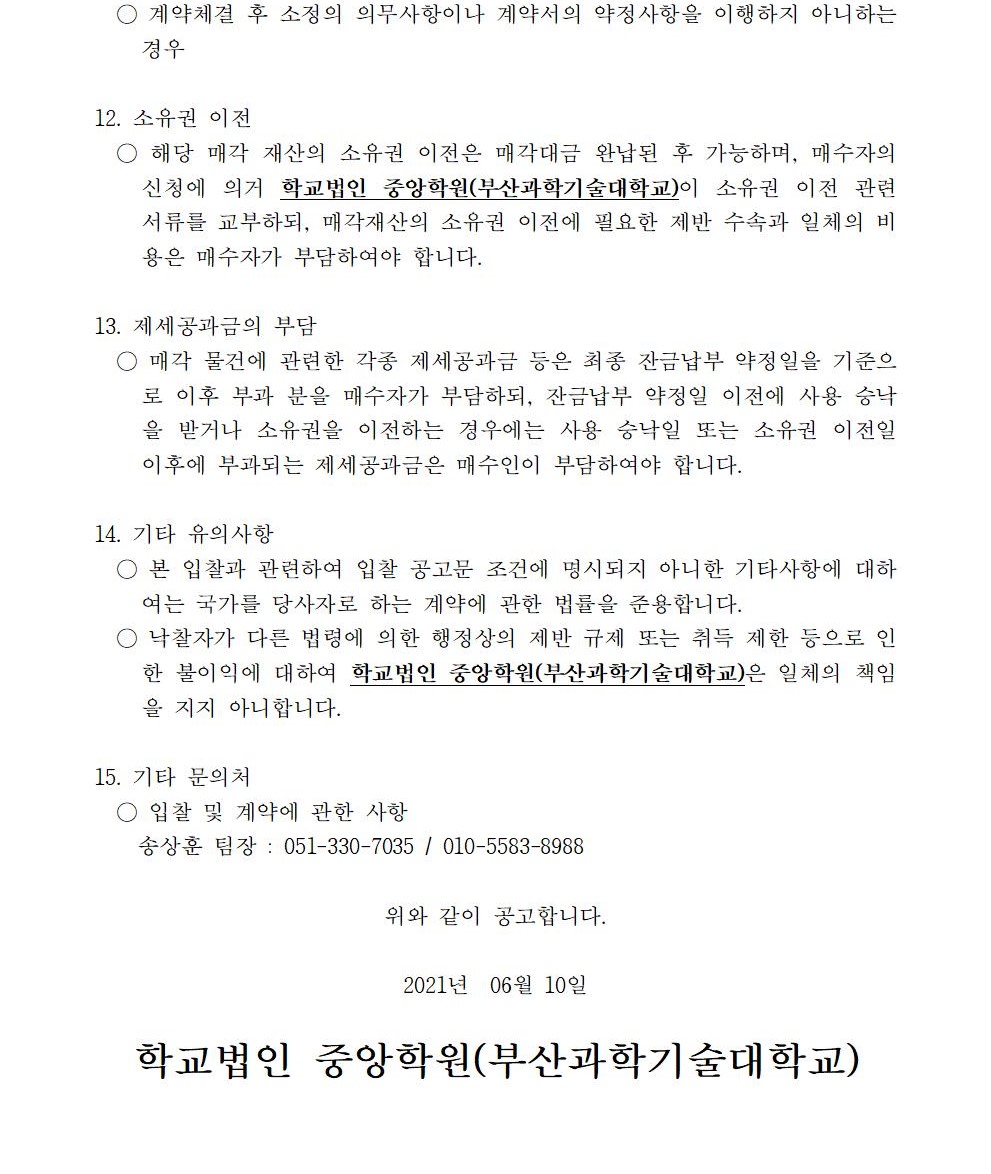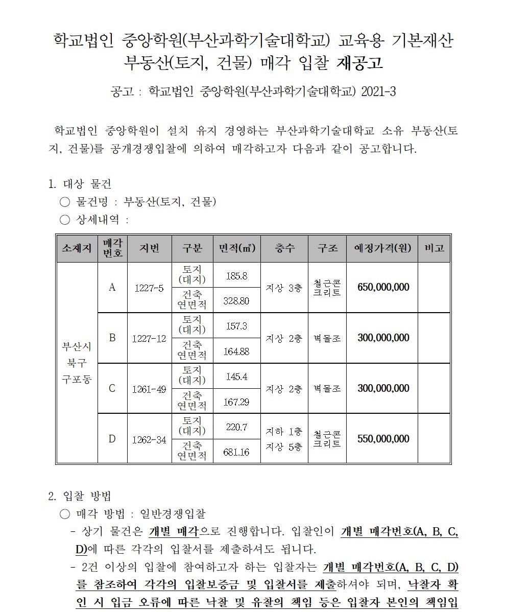 HOME > 기타 > 입찰/채용 입찰/채용 제목 [입찰] 학교법인 중앙학원(부산과학기술대학교) 교육용기본재산 부동산(토지, 건물) 매각 입찰 재공고 등록일 2021.06.10 13:06:56 작성자 행정지원처 첨부파일 붙임1 매각공고문.pdf [82.25 KB]붙임9. 입찰참가 서류 양식(재공고).zip [829.10 KB] 조회 2129 이전글 [입찰] 학교법인 중앙학원 소유 토지 매각 입찰 공고(5차) 재공고 다음글 [채용] 2021학년도 2학기 비정년전임교원 초빙 공고 목록 비밀글 비밀번호 입력 폼 비밀번호 입력 비밀번호를 입력하여 주세요. 관리자는 확인버튼만 누르시면 됩니다. 비밀번호 잘못된 비밀번호입니다. 비밀번호를 다시 입력해주세요. 확인
