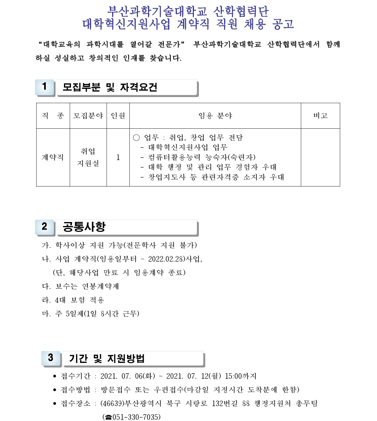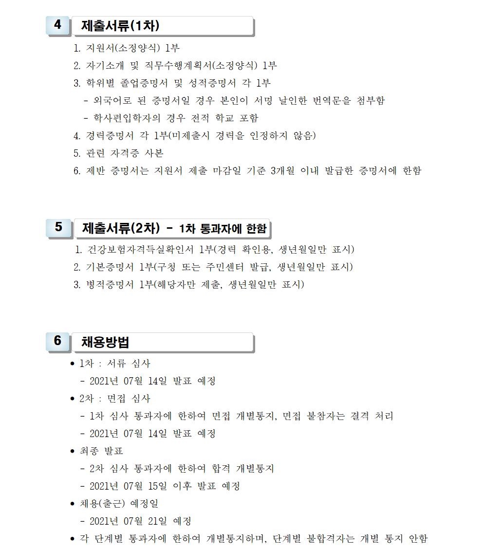 HOME > 기타 > 입찰/채용 입찰/채용 제목 [채용] 산학협력단 대학혁신지원사업 계약직 직원 채용 공고 등록일 2021.07.02 08:07:51 작성자 행정지원처 첨부파일 1-2. 공고문(계약직).pdf [176.31 KB]1-3. 지원서 및 자기소개서(계약직).hwp [24.00 KB] 조회 2027 이전글 [채용] 산학협력단 기술사관육성사업 전담 계약직 직원 채용 다음글 [입찰] 대학혁신 실습실 환경개선공사 입찰(긴급) 목록 비밀글 비밀번호 입력 폼 비밀번호 입력 비밀번호를 입력하여 주세요. 관리자는 확인버튼만 누르시면 됩니다. 비밀번호 잘못된 비밀번호입니다. 비밀번호를 다시 입력해주세요. 확인