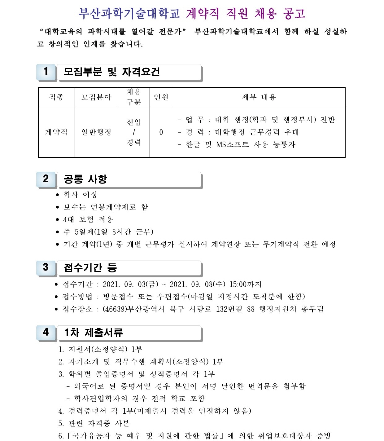 HOME > 기타 > 입찰/채용 입찰/채용 제목 [채용] 부산과학기술대학교 일반행정 계약직 직원 채용 공고 등록일 2021.09.01 11:09:23 작성자 행정지원처 첨부파일 1-2. 공고문(일반행정-계약).pdf [177.91 KB]1-3. 지원서 및 자기소개서(일반행정-계약).hwp [40.50 KB] 조회 2347 이전글 [채용] 2021학년도 2학기 교원(강사) 초빙 공고 (2차) 다음글 [입찰] 일학습병행제 기자재(압밀시험기 등) 구입 입찰 재공고(긴급) 목록 비밀글 비밀번호 입력 폼 비밀번호 입력 비밀번호를 입력하여 주세요. 관리자는 확인버튼만 누르시면 됩니다. 비밀번호 잘못된 비밀번호입니다. 비밀번호를 다시 입력해주세요. 확인