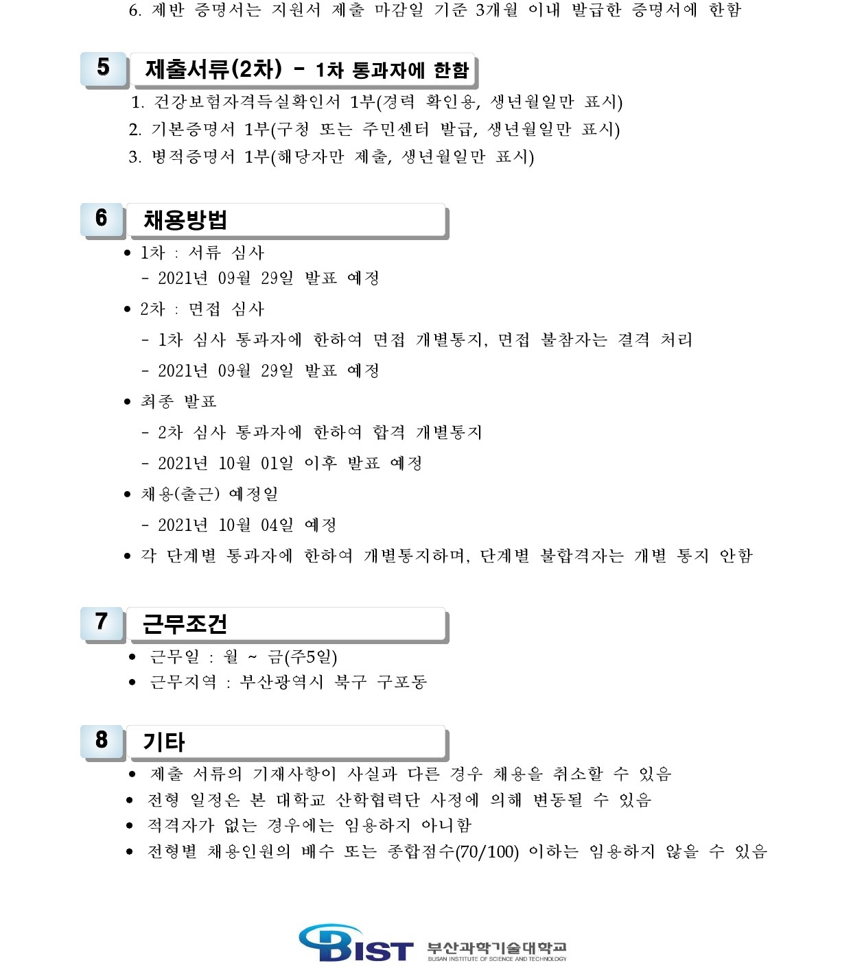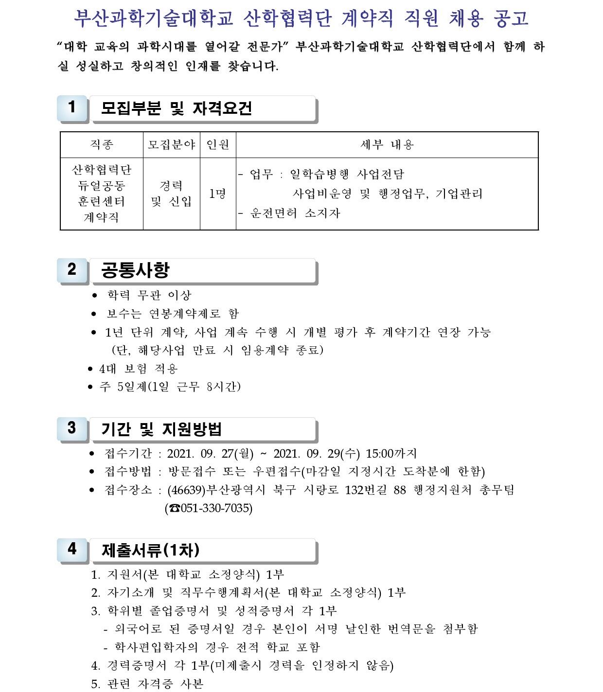 HOME > 기타 > 입찰/채용 입찰/채용 제목 [채용] 산학협력단 듀얼공동훈련센터(일학습병행제사업) 전담 계약직 직원 채용 등록일 2021.09.16 11:09:19 작성자 행정지원처 첨부파일 1-2. 공고문(산단-듀얼공동훈련센터-일학습).pdf [189.70 KB]1-3. 지원서 및 자기소개서(산단-듀얼공동훈련센터-일학습).hwp [23.50 KB] 조회 2002 이전글 [채용] 산학협력단 대학혁신지원사업 계약직 직원 채용 공고 다음글 [입찰] 학교법인 중앙학원(부산과학기술대학교) 교육용기본재산 부동산(토지, 건물) 매각 입찰 공고 목록 비밀글 비밀번호 입력 폼 비밀번호 입력 비밀번호를 입력하여 주세요. 관리자는 확인버튼만 누르시면 됩니다. 비밀번호 잘못된 비밀번호입니다. 비밀번호를 다시 입력해주세요. 확인