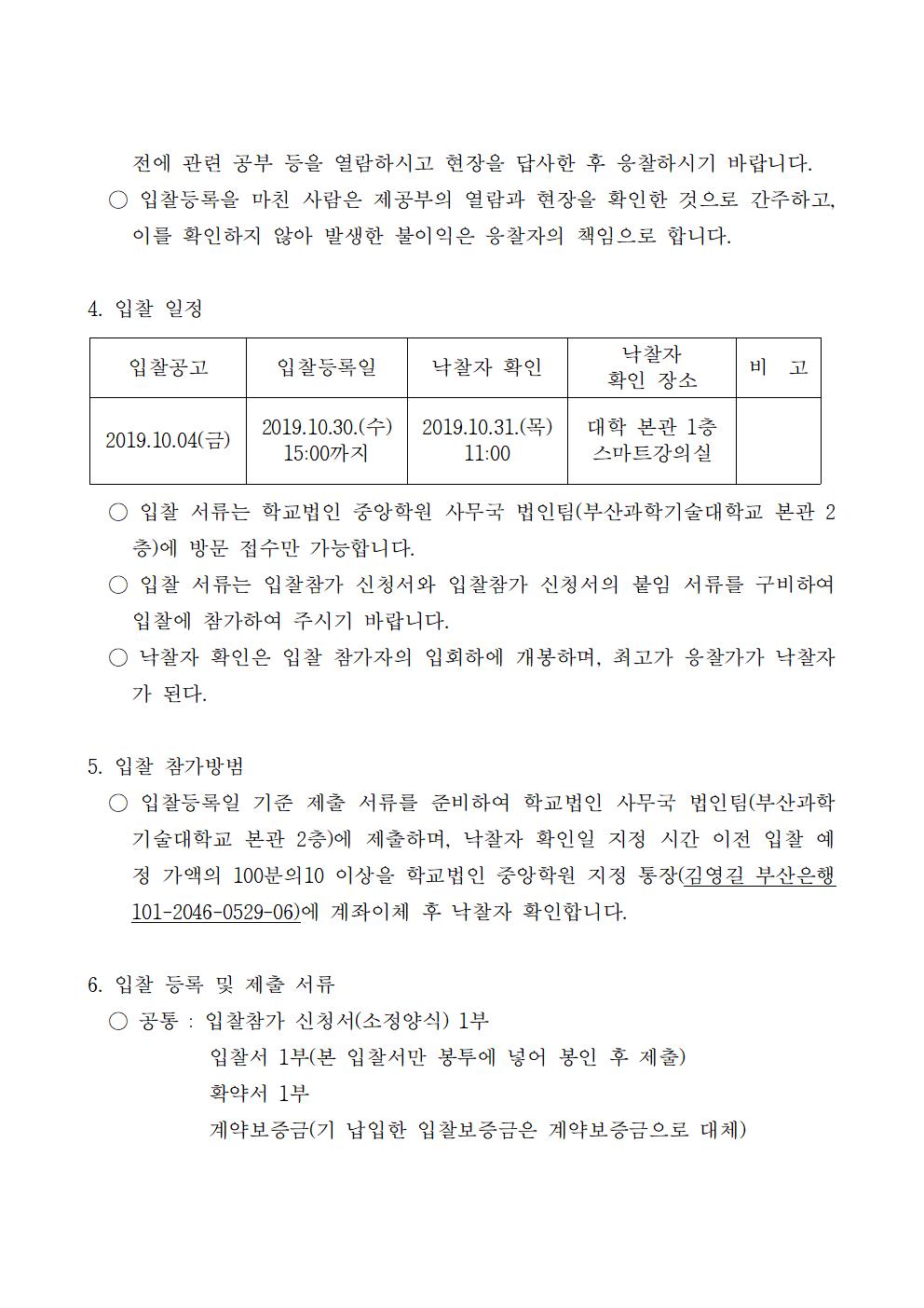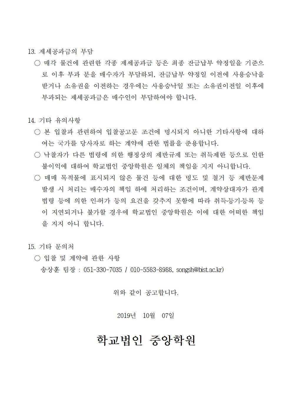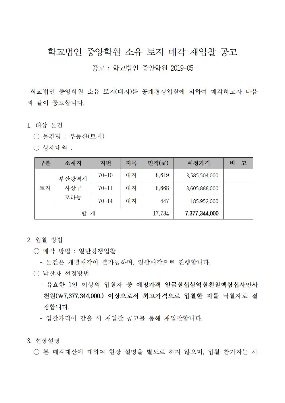 HOME > 기타 > 입찰/채용 입찰/채용 제목 [입찰] 학교법인 중앙학원 소유 토지 매각 입찰 재공고 등록일 2019.10.07 16:59:50 작성자 행정지원처 첨부파일 붙임1 매각공고문.pdf [77.56 KB]붙임2 안내문.pdf [503.22 KB]붙임3 입찰참가 신청서.pdf [41.59 KB]붙임4 입찰서, 유의사항.pdf [38.03 KB]붙임5. 확약서.pdf [28.60 KB] 조회 4206 이전글 [채용] 산학협력단 기술사관육성사업 전담 계약직 직원 채용 다음글 [채용] 부산과학기술대학교 산학협력단(후진학선도형) 계약직 직원 추가 채용 공고 목록 비밀글 비밀번호 입력 폼 비밀번호 입력 비밀번호를 입력하여 주세요. 관리자는 확인버튼만 누르시면 됩니다. 비밀번호 잘못된 비밀번호입니다. 비밀번호를 다시 입력해주세요. 확인