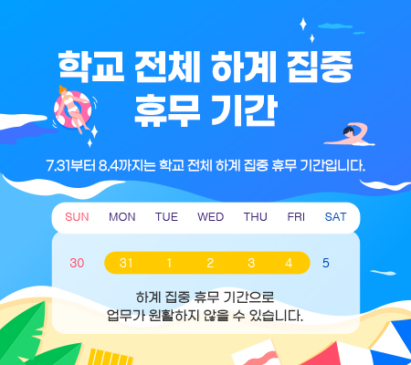 HOME > 입학도우미 > 공지사항 공지사항 제목 학교 전체 하계 집중 휴무기간 안내(7/31~8/4) 등록일 2023.07.27 13:07:42 작성자 관리자 첨부파일 조회 336 이전글 2024학년도 부산과학기술대학교 입학전형 시행계획 안내(2차 변경) 다음글 2024학년도 수시모집 일정 안내 목록 비밀글 비밀번호 입력 폼 비밀번호 입력 비밀번호를 입력하여 주세요. 관리자는 확인버튼만 누르시면 됩니다. 비밀번호 잘못된 비밀번호입니다. 비밀번호를 다시 입력해주세요. 확인